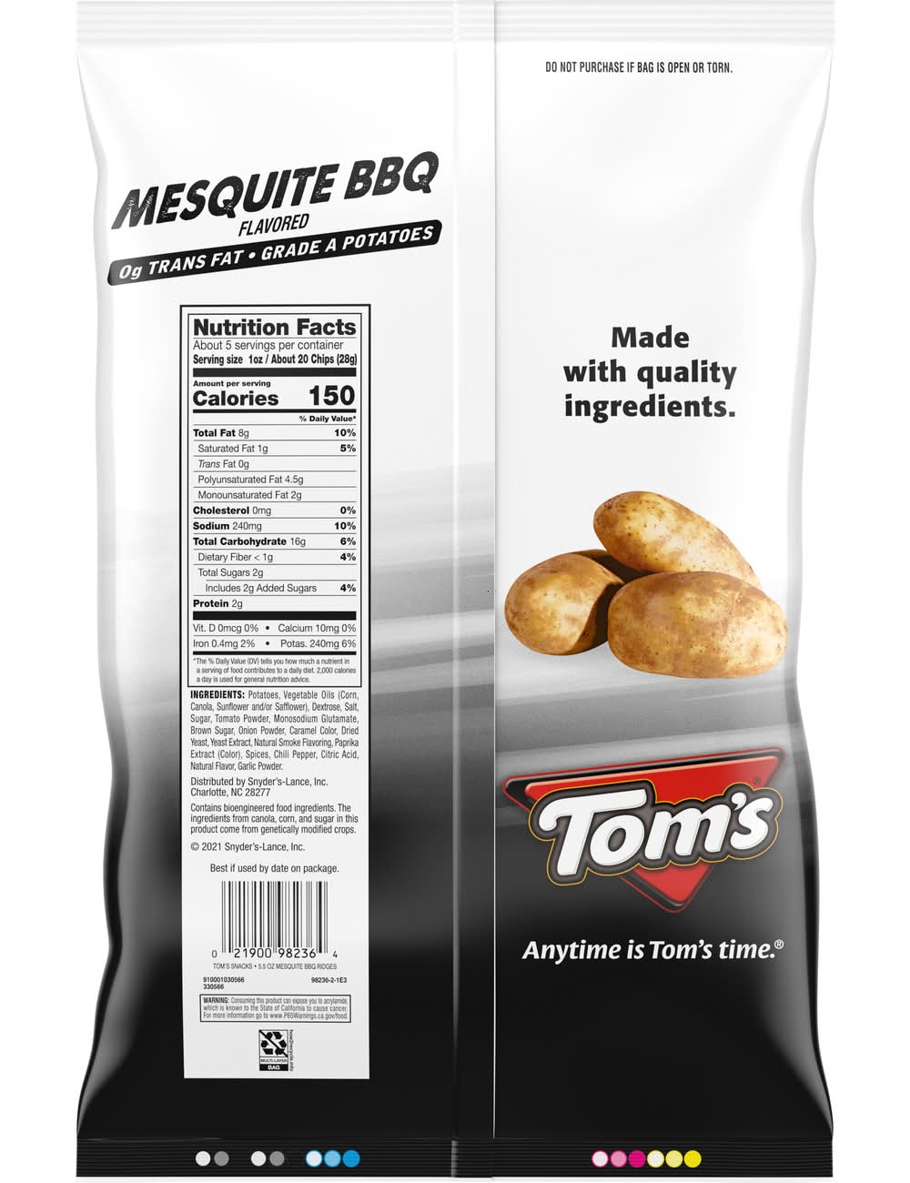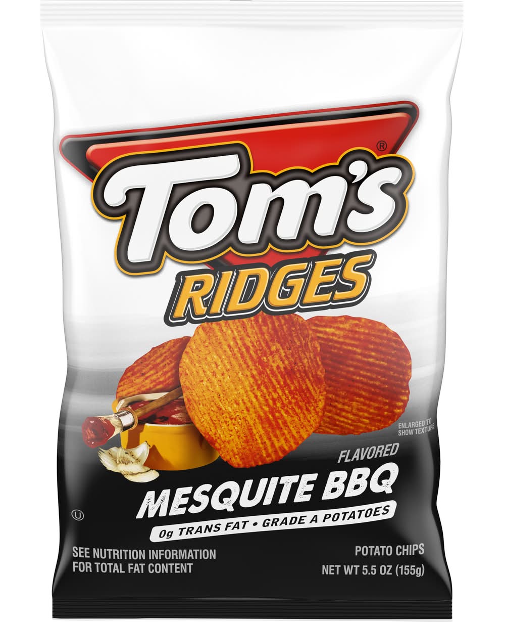 Bring a bold and slightly sweet crunch to your day with Tom's Mesquite BBQ Flavored Ridges Potato Chips. These ridged potato chips have the barbecue flavor you love, making them an easy way to take care of all of your cravings, whether you enjoy them alone or pair them with your favorite dips. Fire up the grill, get the coals smokin' hot and open up a bag of flavor-bursting Mesquite BBQ ridged potato chips! Anytime is Tom's time. • Snyder's-Lance, Inc., Charlotte, NC, 28277 • Packaging: Reusable
