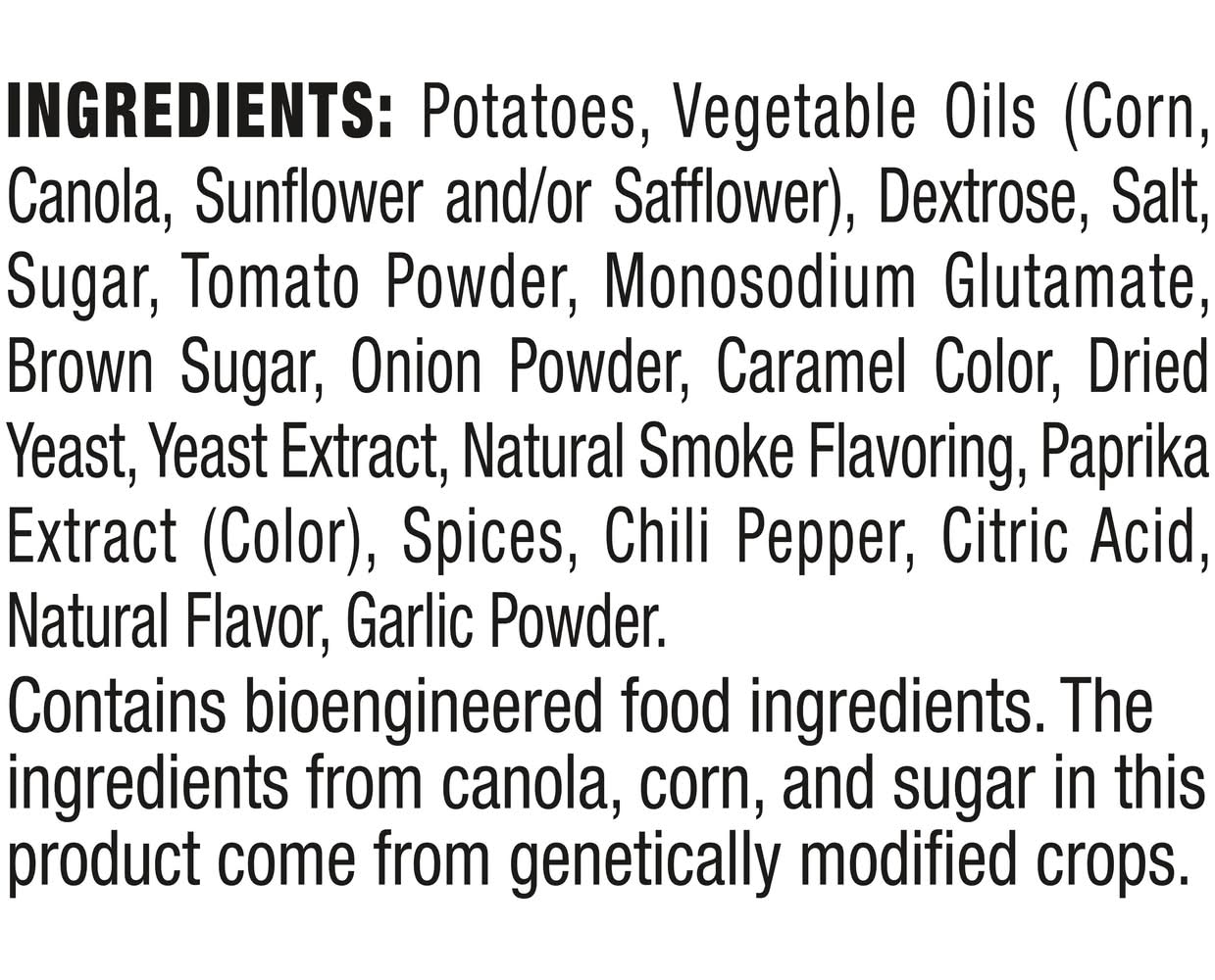 Ingredients: INGREDIENTS: POTATOES, VEGETABLE OILS (CORN, CANOLA, SUNFLOWER AND/OR SAFFLOWER), DEXTROSE, SALT, SUGAR, TOMATO POWDER, MONOSODIUM GLUTAMATE, BROWN SUGAR, ONION POWDER, CARAMEL COLOR, DRIED YEAST, YEAST EXTRACT, NATURAL SMOKE FLAVORING, PAPRIKA EXTRACT (COLOR), SPICES, CHILI PEPPER, CITRIC ACID, NATURAL FLAVOR, GARLIC POWDER.