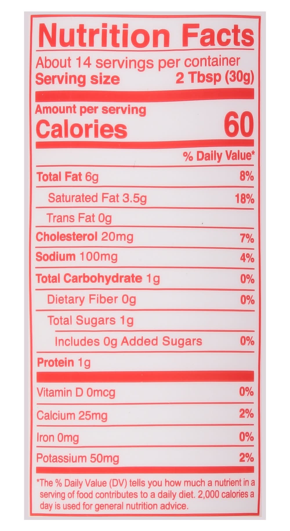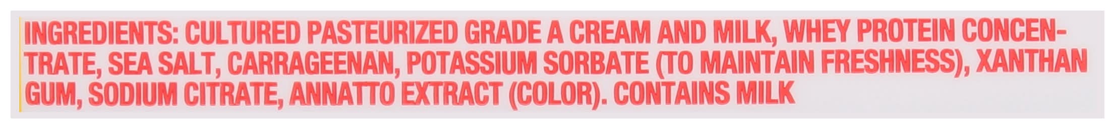 Ingredients: Cultured Pasteurized Grade A Cream and Milk, Whey Protein Concentrate, Sea Salt, Carrageenan, Potassium Sorbate (to Maintain Freshness), Xanthan Gum, Sodium Citrate, Annatto Extract (Color) Contains: Milk