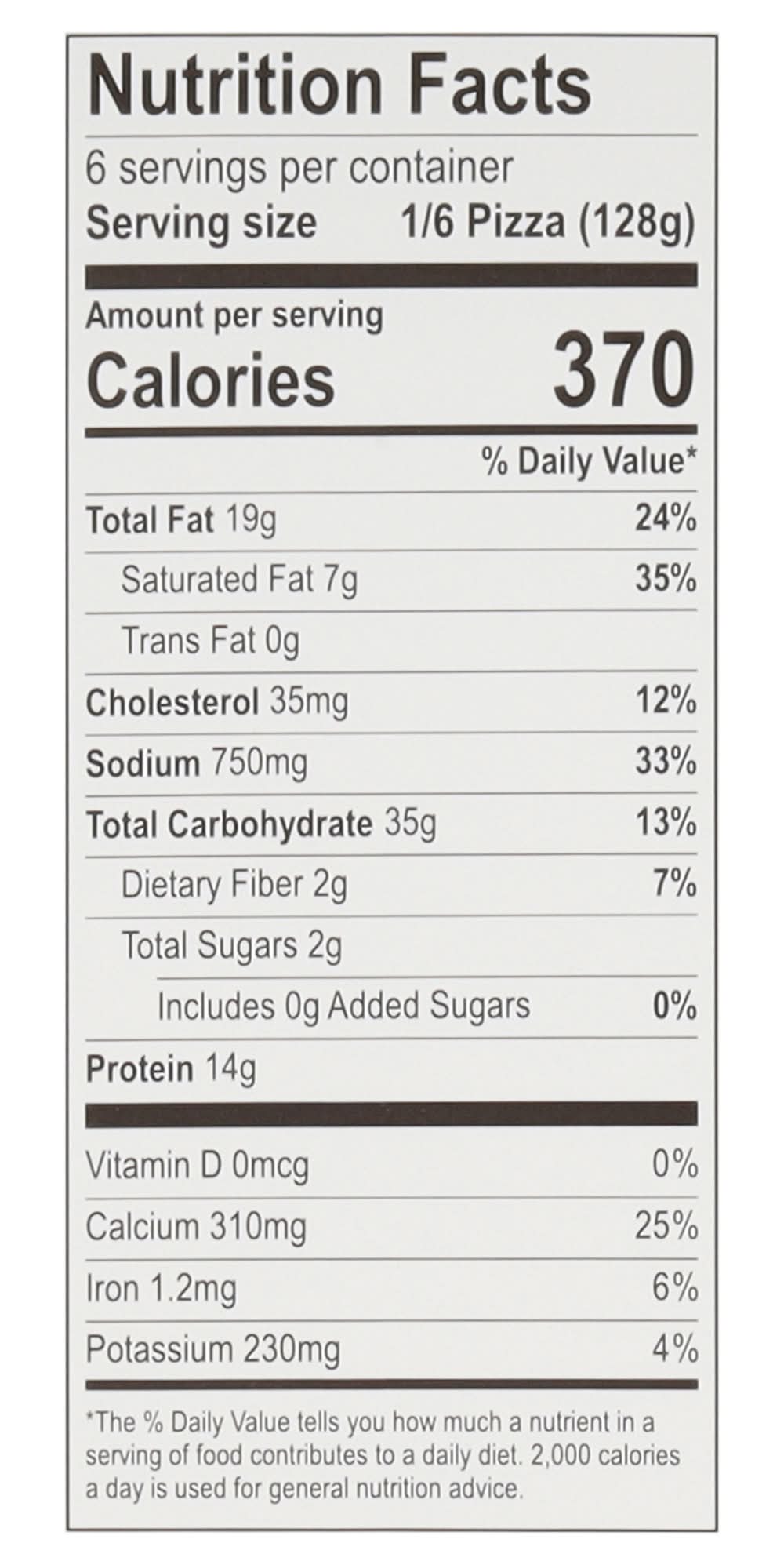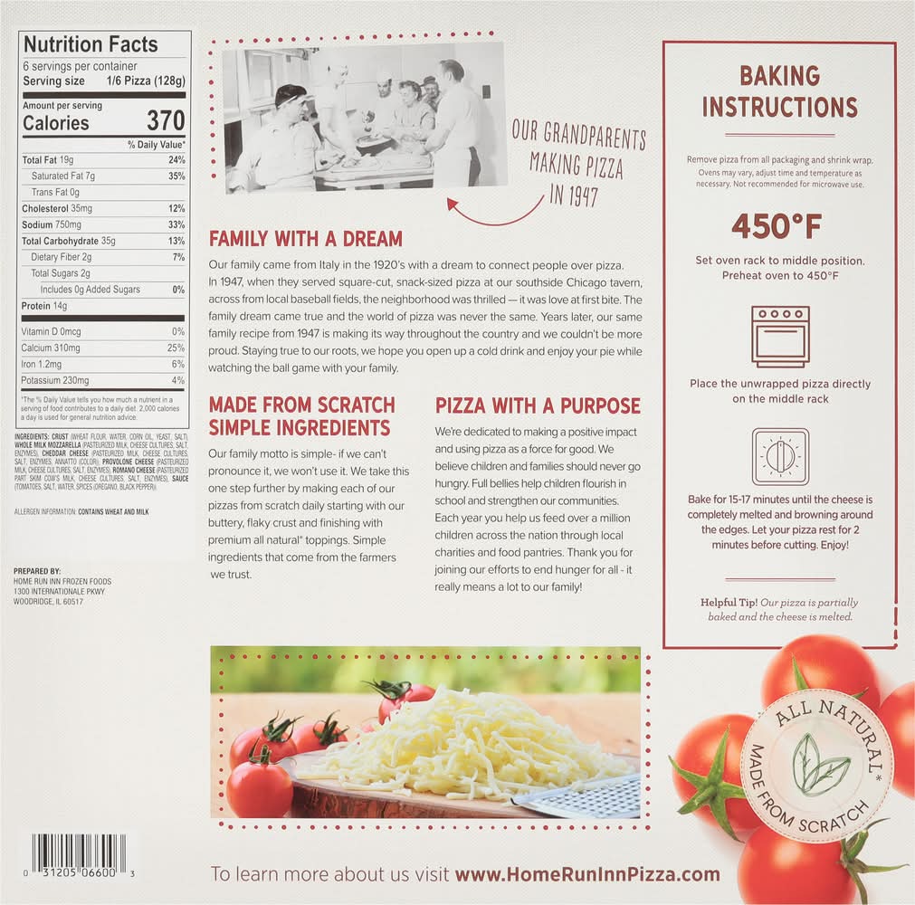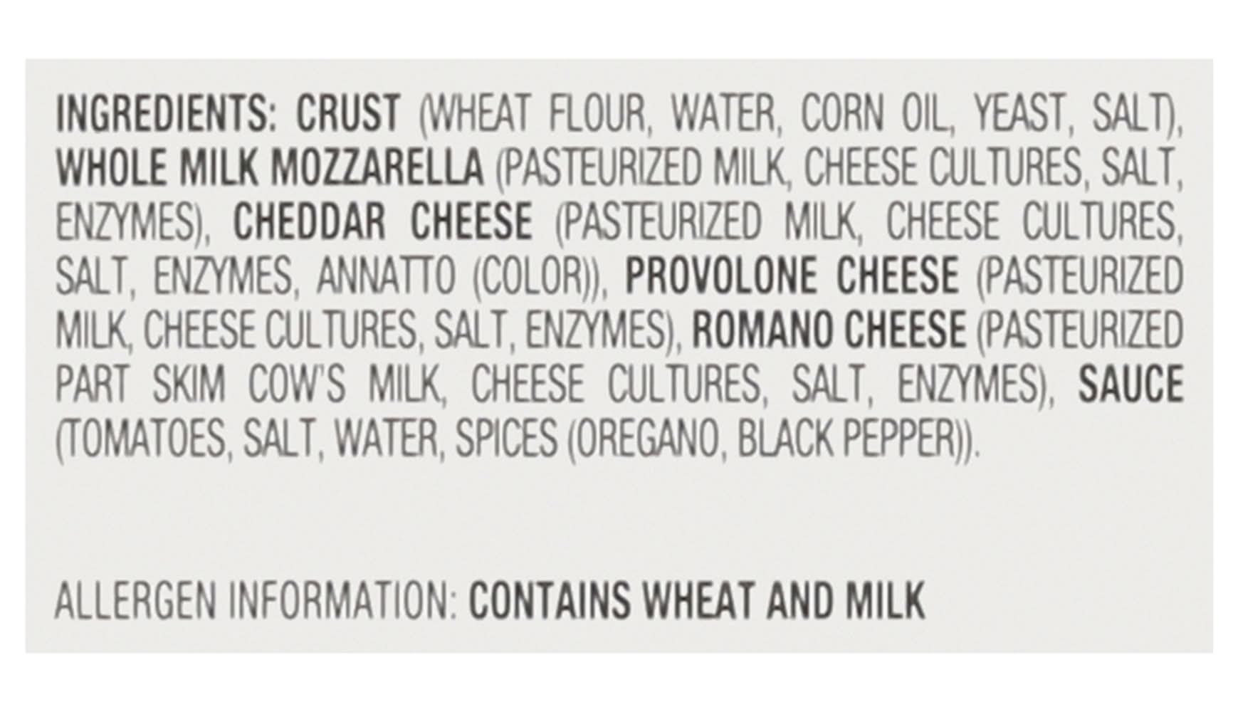 Ingredients: Crust (Wheat Flour, Water, Corn Oil, Yeast, Salt), Whole Milk Mozzarella (Pasteurized Milk, Cheese Cultures, Salt, Enzymes), Cheddar Cheese (Pasteurized Milk, Cheese Cultures, Salt, Enzymes, Annatto (Color)), Provolone Cheese (Pasteurized Milk, Cheese Cultures, Salt, Enzymes), Romano Cheese (Pasteurized Part Skim Cow's Milk, Cheese Cultures, Salt, Enzymes), Sauce (Tomatoes, Salt, Water, Spices (Oregano, Black Pepper)) Contains: Wheat, Milk