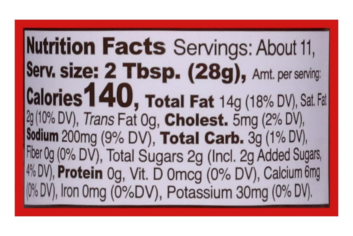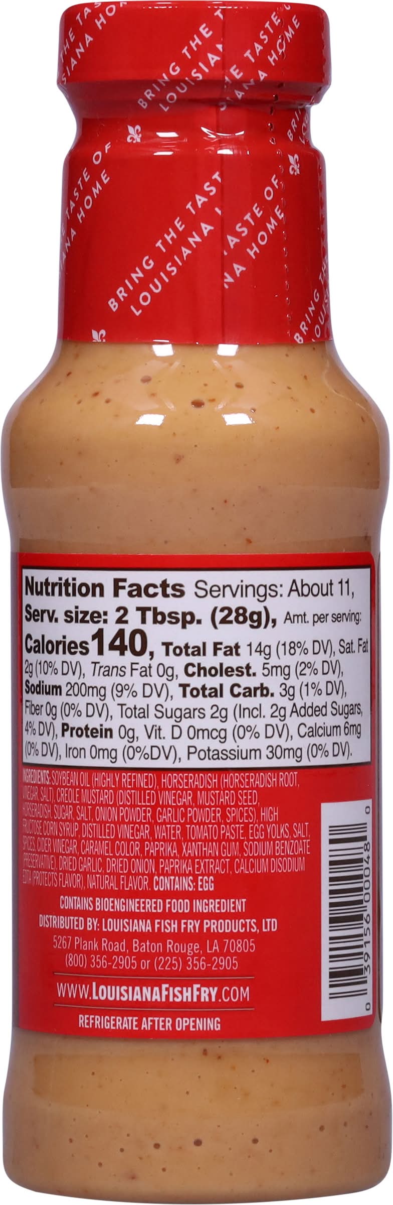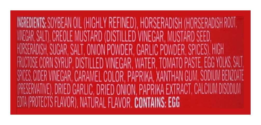 Ingredients: Soybean Oil (Highly Refined), Horseradish (Horseradish Root, Vinegar, Salt), Creole Mustard (Distilled Vinegar, Mustard Seed, Horseradish, Sugar, Salt, Onion Powder, Garlic Powder, Spices), High Fructose Corn Syrup, Distilled Vinegar, Water, Tomato Paste, Egg Yolks, Salt, Spices, Cider Vinegar, Caramel Color, Paprika, Xanthan Gum, Sodium Benzoate (Preservative), Dried Garlic, Dried Onion, Paprika Extract, Calcium Disodium EDTA (Protects Flavor), Natural Flavor Contains: Soybeans, Eggs, Corn, Mustard