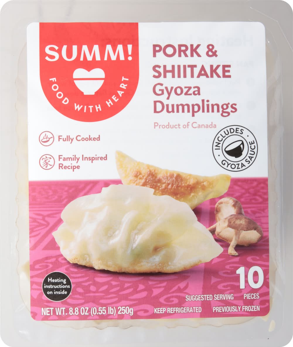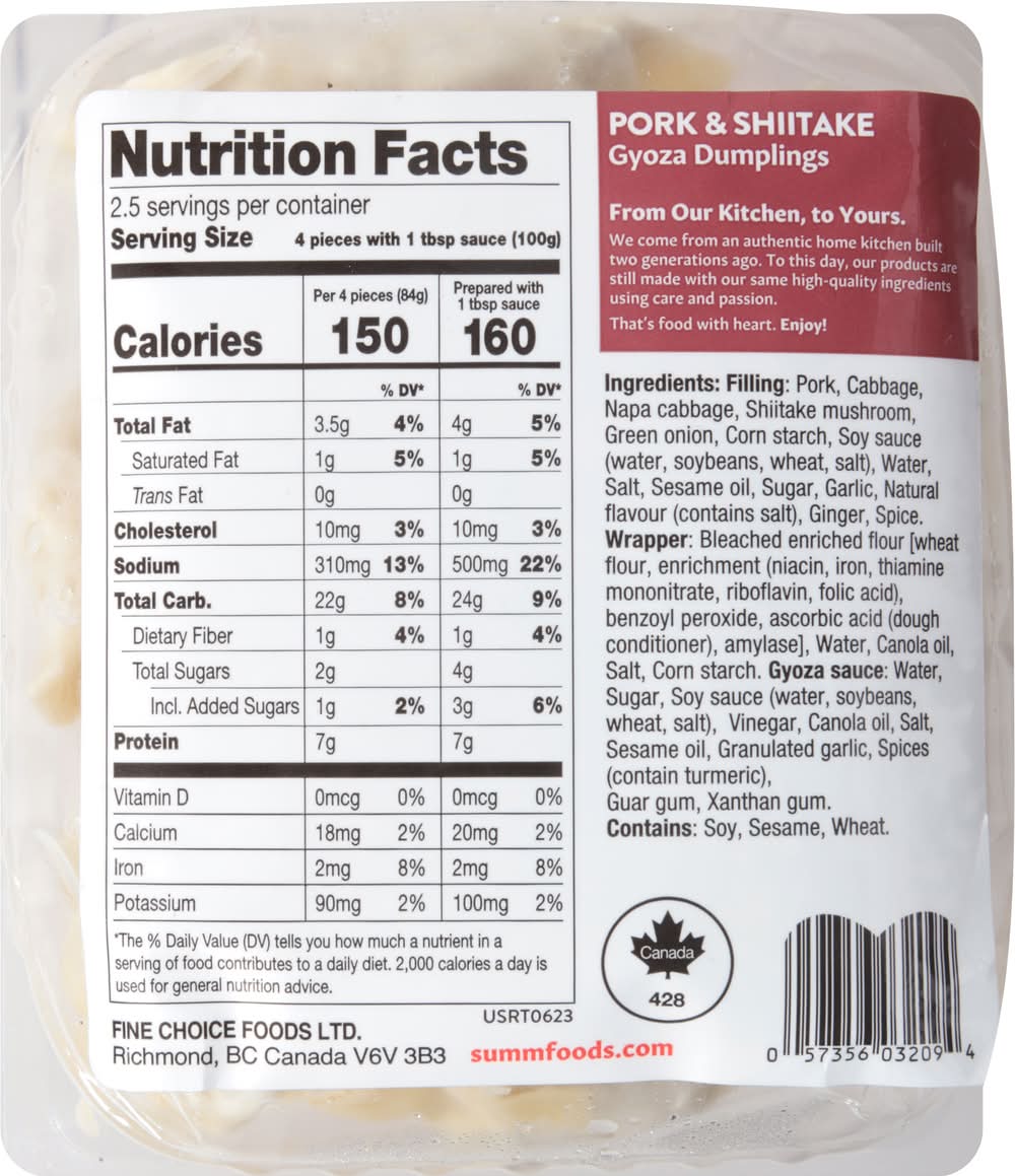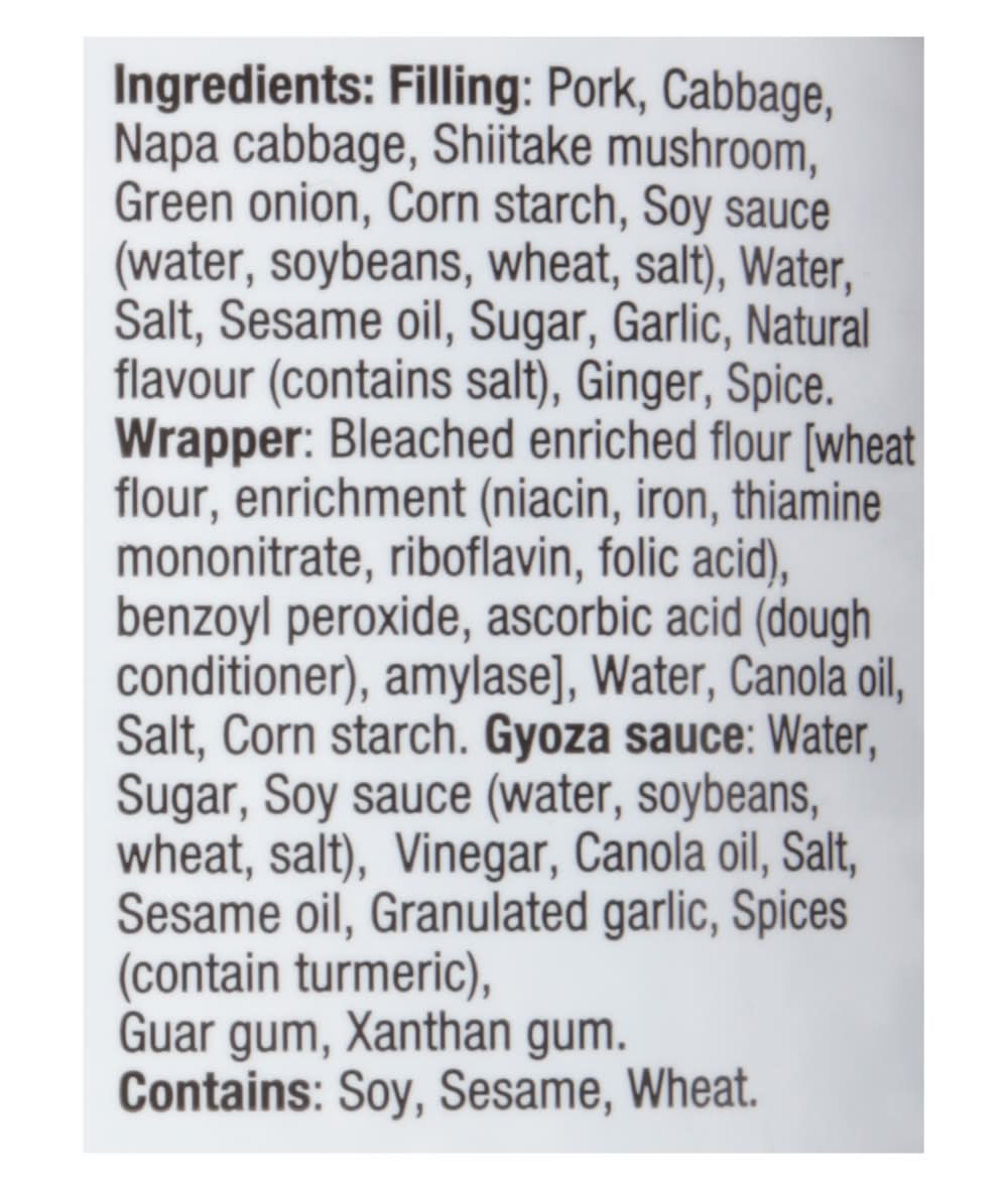 Ingredients: Filling: Pork, Cabbage, Napa Cabbage, Shiitake Mushroom, Green Onion, Corn Starch, Soy Sauce (Water, Soybeans, Wheat, Salt), Water, Salt, Sesame Oil, Sugar, Garlic, Natural Flavour (Contains Salt), Ginger, Spice. Wrapper: Bleached Enriched Flour [Wheat Flour, Enrichment (Niacin, Iron, Thiamine Mononitrate, Riboflavin, Folic Acid), Benzoyl Peroxide, Ascorbic Acid (Dough Conditioner), Amylase], Water, Canola Oil, Salt, Corn Starch. Gyoza Sauce: Water, Sugar, Soy Sauce (Water, Soybeans, Wheat, Salt), Vinegar, Canola Oil, Salt, Sesame Oil, Granulated Garlic, Spices (Contain Turmeric), Guar Gum, Xanthan Gum Contains: Soybeans, Sesame, Wheat, Corn