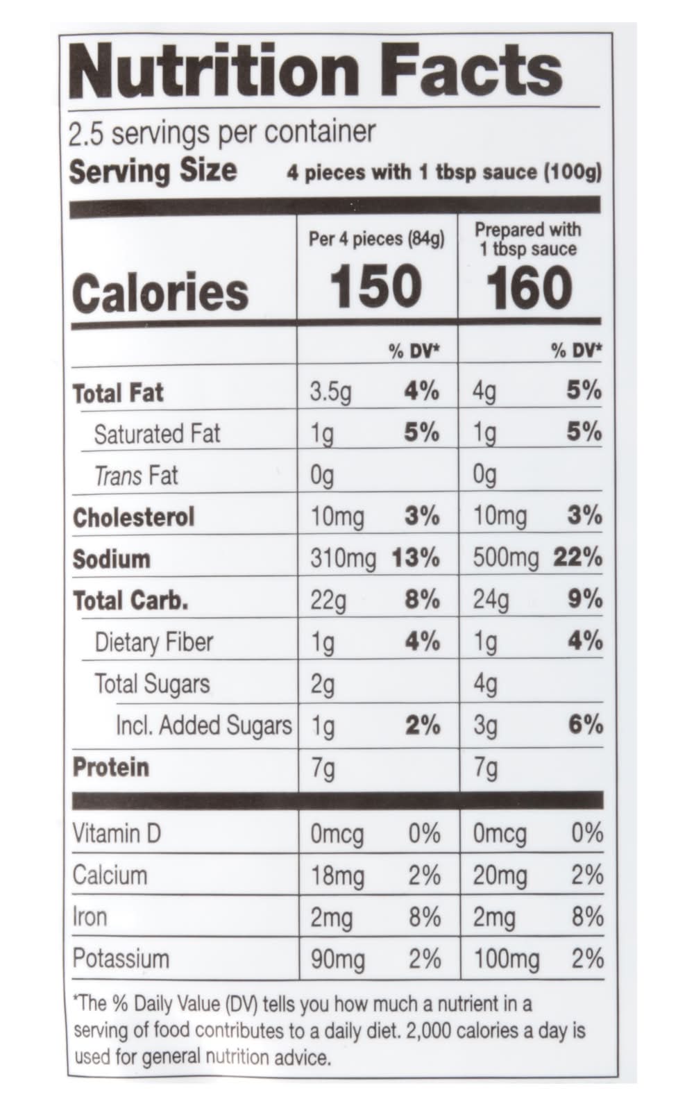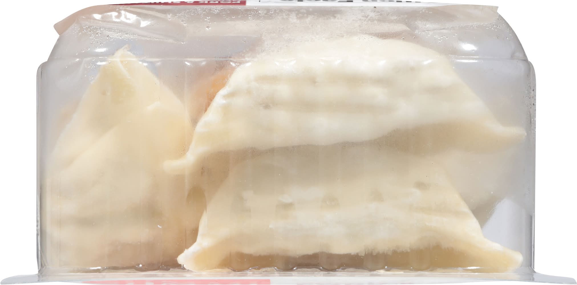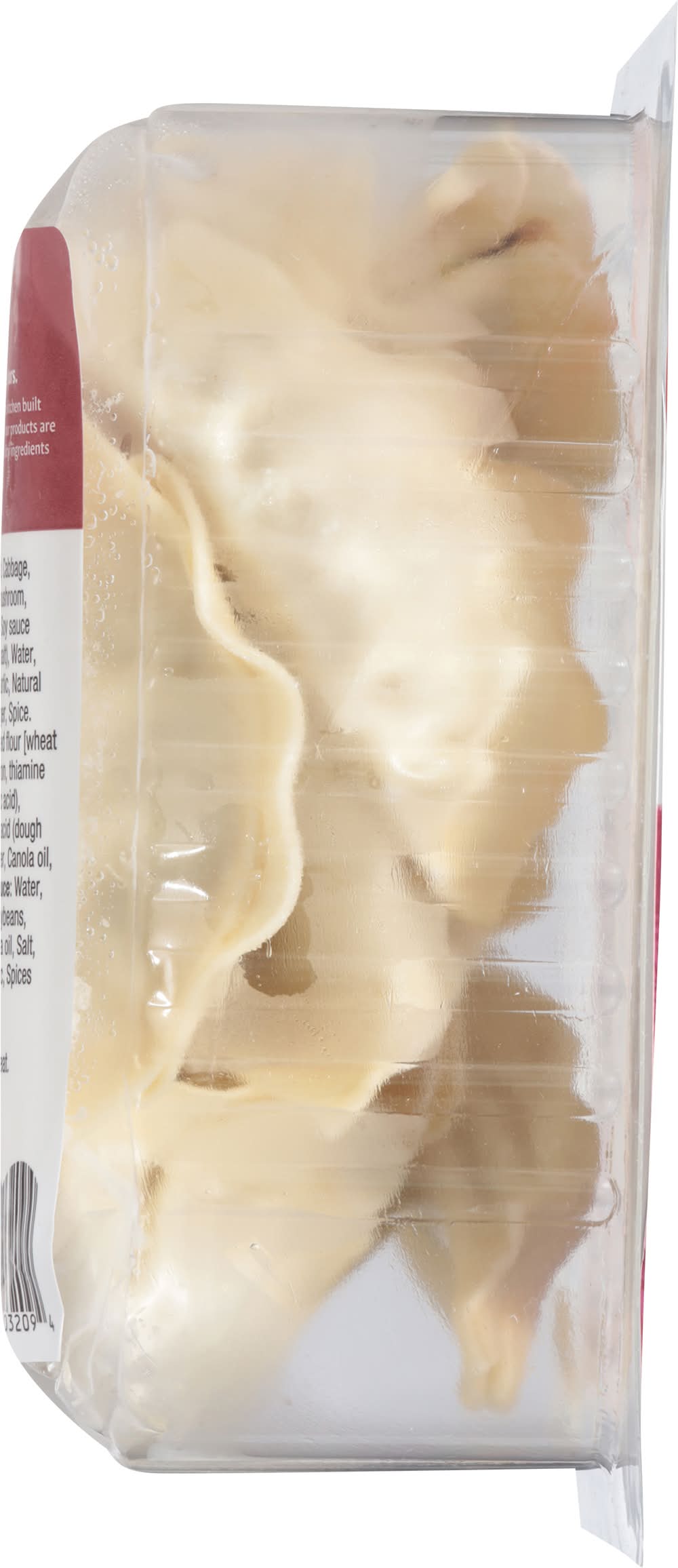 Ingredients: Filling: Pork, Cabbage, Napa Cabbage, Shiitake Mushroom, Green Onion, Corn Starch, Soy Sauce (Water, Soybeans, Wheat, Salt), Water, Salt, Sesame Oil, Sugar, Garlic, Natural Flavour (Contains Salt), Ginger, Spice. Wrapper: Bleached Enriched Flour [Wheat Flour, Enrichment (Niacin, Iron, Thiamine Mononitrate, Riboflavin, Folic Acid), Benzoyl Peroxide, Ascorbic Acid (Dough Conditioner), Amylase], Water, Canola Oil, Salt, Corn Starch. Gyoza Sauce: Water, Sugar, Soy Sauce (Water, Soybeans, Wheat, Salt), Vinegar, Canola Oil, Salt, Sesame Oil, Granulated Garlic, Spices (Contain Turmeric), Guar Gum, Xanthan Gum Contains: Soybeans, Sesame, Wheat, Corn