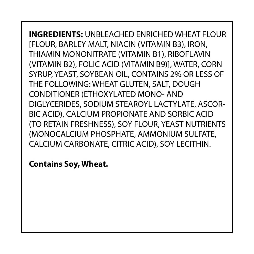 Ingredients: Unbleached Enriched Wheat Flour [Flour, Barley Malt, Niacin (Vitamin B3), Iron, Thiamin Mononitrate (Vitamin B1), Riboflavin (Vitamin B2), Folic Acid (Vitamin B9)], Water, Corn Syrup, Yeast, Soybean Oil, Contains 2% or Less of the Following: Wheat Gluten, Salt, Dough Conditioner (Mono and Diglycerides Ethoxylated Mono and Diglycerides Sodium Stearoyl Lactylate Ascorbic Acid), Calcium Propionate (to Retain Freshness), Soy Flour, Yeast Nutrients (Calcium Sulfate Monocalcium Phosphate Ammonium Sulfate Calcium Carbonate Citric Acid), Sorbic Acid (to Retain Freshness), Hydrogenated Vegetable Oil, Sodium Alginate, Soy Lecithin Contains: Soybeans, Wheat, Milk, Eggs, Tree Nuts