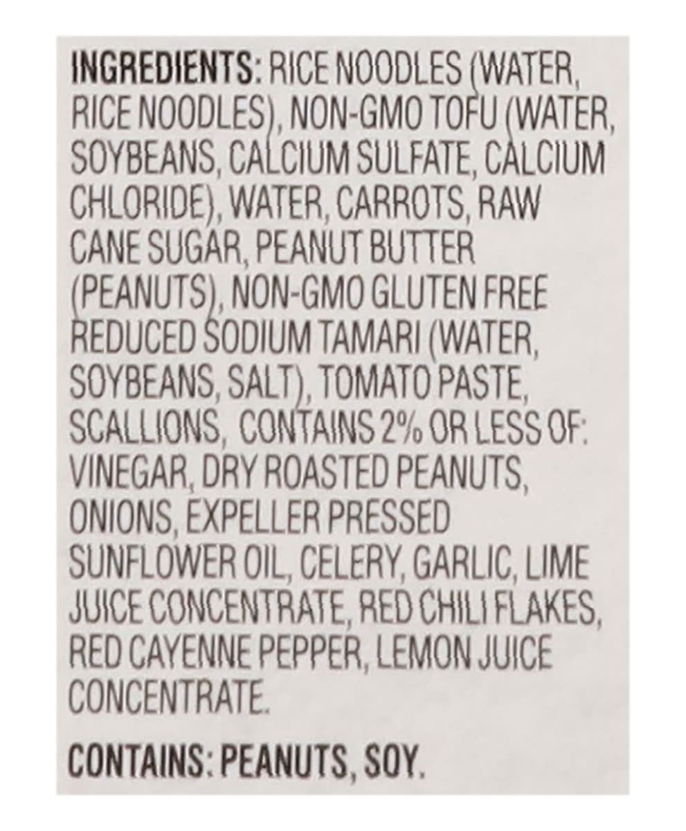 Ingredients: Rice Noodles (Water, Rice Noodles), Non-GMO Tofu (Water, Soybeans, Calcium Sulfate, Calcium Chloride), Water, Carrots, Raw Cane Sugar, Peanut Butter (Peanuts), Non-GMO Gluten Free Reduced Sodium Tamari (Water, Soybeans, Salt), Tomato Paste, Scallions, Contains 2% or Less of: Vinegar, Dry Roasted Peanuts, Onions, Expeller Pressed Sunflower Oil, Celery, Garlic, Lime Juice Concentrate, Red Chili Flakes, Red Cayenne Pepper, Lemon Juice Concentrate Contains: Peanuts, Soybeans, Celery
