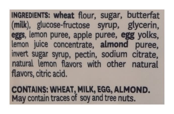 Ingredients: Wheat Flour, Sugar, Butterfat (Milk), Glucose-Fructose Syrup, Glycerin, Eggs, Lemon Puree, Apple Puree, Egg Yolks, Lemon Juice Concentrate, Almond Puree, Invert Sugar Syrup, Pectin, Sodium Citrate, Natural Lemon Flavors with Other Natural Flavors, Citric Acid Contains: Wheat, Eggs, Milk, Tree Nuts, Soybeans, Tree Nuts
