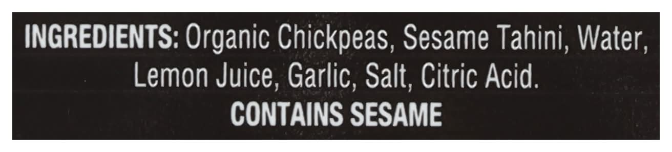 Ingredients: Organic Chickpeas, Sesame Tahini, Water, Lemon Juice, Garlic, Salt, Citric Acid Contains: Sesame
