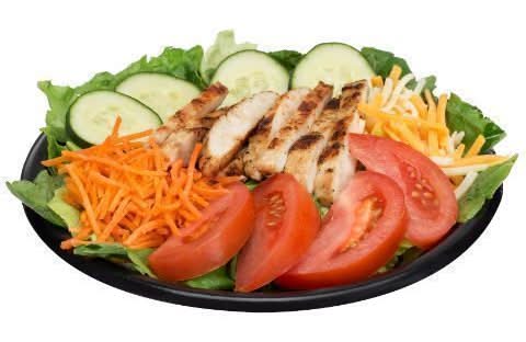A refreshing salad with lettuce, tomatoes, cucumber, sliced carrots, cheese, and grilled chicken. Brand: 7-eleven