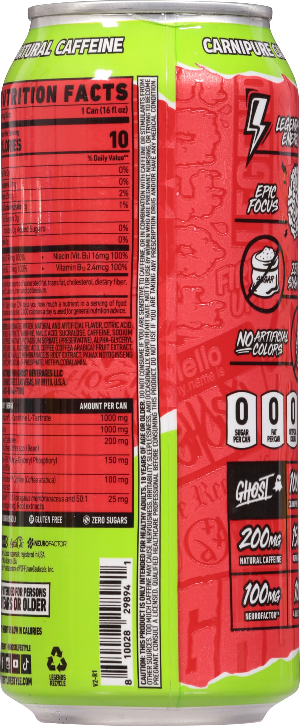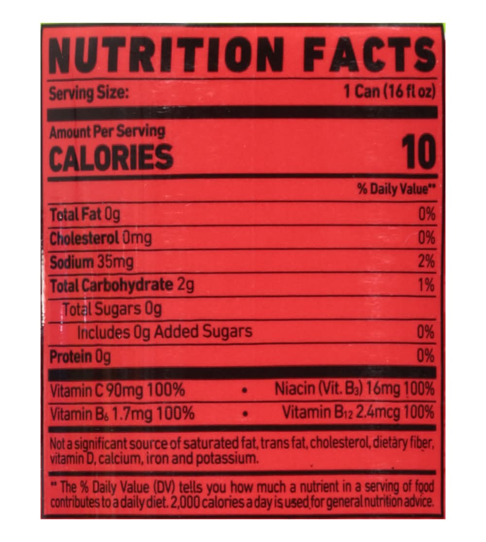 Ingredients: Carbonated Water, Natural and Artificial Flavor, Citric Acid, L-Carnitine L-Tartrate, Taurine, Malic Acid, Sucralose, Caffeine, Sodium Benzoate (Preservative), Potassium Sorbate (Preservative), Alpha-Glyceryl Phosphoryl Choline, Ascorbic Acid, Coffee (Coffea Arabica) Fruit Extract Niacinamide, Astragalus Membranaceus Root Extract, Panax Notoginseng Root Extract, Pyridoxal-5-Phosphate, Methylcobalamin