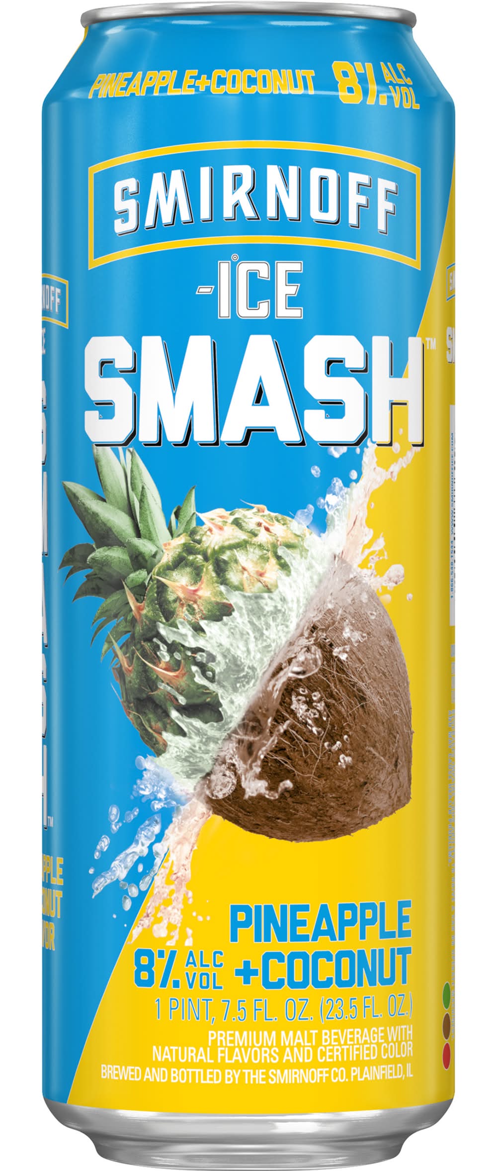 Smirnoff Ice Smash Pineapple + Coconut features a tropical fusion of luscious pineapple and sweet coconut flavors. Lightly carbonated with a refreshing flavor, Smirnoff Ice Smash Pineapple + Coconut is great for parties, barbecues and picnics or a casual evening with friends. Smirnoff Ice Smash has 8% ABV and natural flavors. One of the most popular malt beverages in the nation, Smirnoff Ice has been a staple of get-togethers and parties since 1999. Please drink responsibly. • Brand: Smirnoff • Flavor: Pineapple-cocount • Alcohol by volume: 8% • Smirnoff Co., Plainfield,IL • Packaging: Reusable