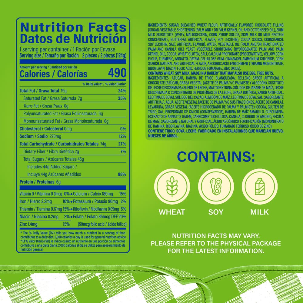 Ingredients: SUGAR, ARTIFICIALLY FLAVORED CHOCOLATE FILLING, SUGAR, VEGETABLE SHORTENING [PALM AND/OR PALM KERNEL OIL AND COTTONSEED OIL], SKIM MILK SUBSTITUTE [WHEY, MALTODEXTRIN, CORN SYRUP SOLIDS, SKIM MILK OR MILK PROTEIN CONCENTRATE, BUTTERFAT, ARTIFICIAL FLAVOR, SOY LECITHIN], COCOA SOLIDS, CORNSTARCH, SOY LECITHIN, SALT, ARTIFICIAL FLAVOR, BLEACHED WHEAT FLOUR, WATER, VEGETABLE SHORTENING [PALM AND/OR FRACTIONATED PALM OIL], EGGS, YEAST, VEGETABLE SHORTENING [HYDROGENATED PALM AND PALM KERNEL OIL], COCOA, WHEAT GLUTEN, NON-FAT MILK, MONO- AND DIGLYCERIDES, PROPYLENE GLYCOL ESTERS OF FATTY ACIDS, SALT, AGAR, CALCIUM PROPIONATE (PRESERVATIVE), ASCORBIC ACID, YELLOW CORN FLOUR, TURMERIC, ANNATTO, CELLULOSE GUM, DATEM, CINNAMON, SORBITAN MONOSTEARATE, NATURAL AND ARTIFICIAL FLAVOR, MONOCALCIUM PHOSPHATE, AMMONIUM CHLORIDE, CORNSTARCH. Contains: CONTAINS EGG, MILK, SOY, WHEAT.