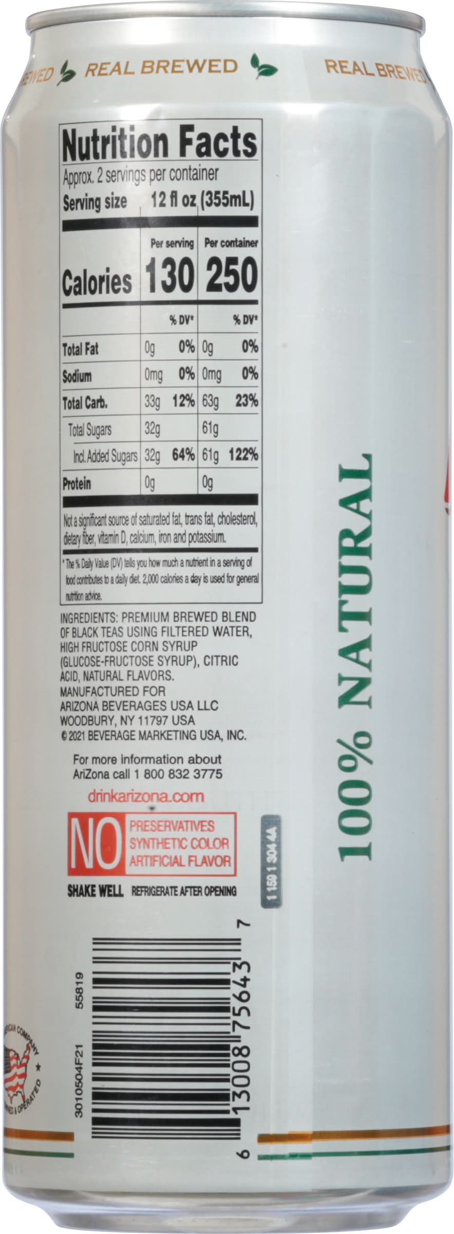 No preservatives, synthetic color, artificial flavor. 100% natural • Brand: Arizona • kosher