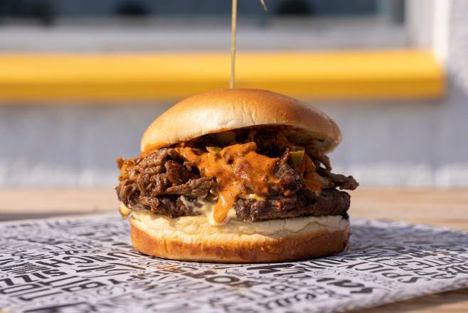 Introducing the Bully Burger! It's got a Juicy Beef Patty, Spicy Gyros, Philly meat, melty American cheese, grilled Onions grilled Jalapeños, and a fiery Spicy Sauce.
