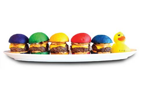 Choice of beef crsipy chicken or veggie burger. Five classic mini burgers served on five colorful toasted buttered sliders buns, topped with American cheese, pickles, crsipy onions, and sugar factory sauce.