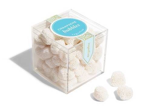 Made in the USA delicate, sweet, and chic, champagne bubbles are one of our all-time favorite gummies. Dressed up in tiny white nonpareils, each juicy little bite bursts with the flavors of the finest champagne. Sophisticated yet playful, you'll love each bubbly sip. Champagne bubbles are perfect for favors and gifts. Visit our custom page for more information about creating beautiful personalized favors in your colors and theme. Non-alcoholic and available to ship to any state. Gluten-free, kosher. gluten-free