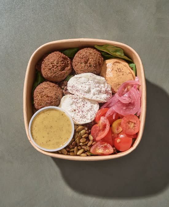spinach, lentils, falafel, burrata, harissa hummus, tomato+cucumber+onion, pumpkin seed, lemon herb vinaigrette