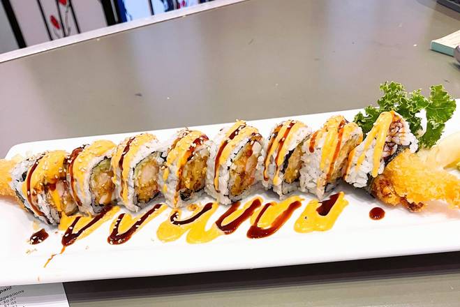 Soft shell crab, shrimp tempura, shrimp, crab , cream cheese , eel sauce spicy Mayo , sesame seed