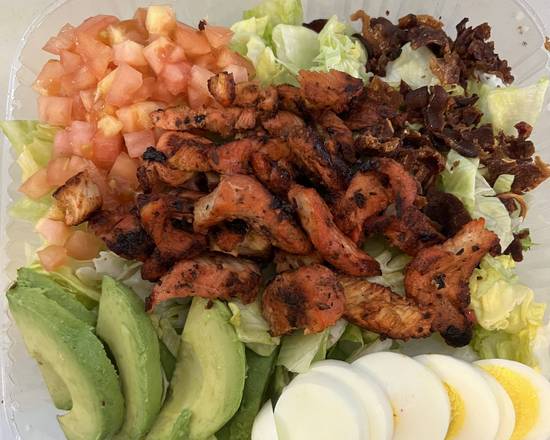iceberg, grilled chicken, egg, bacon bits, avocado, tomato, choice of dressing
