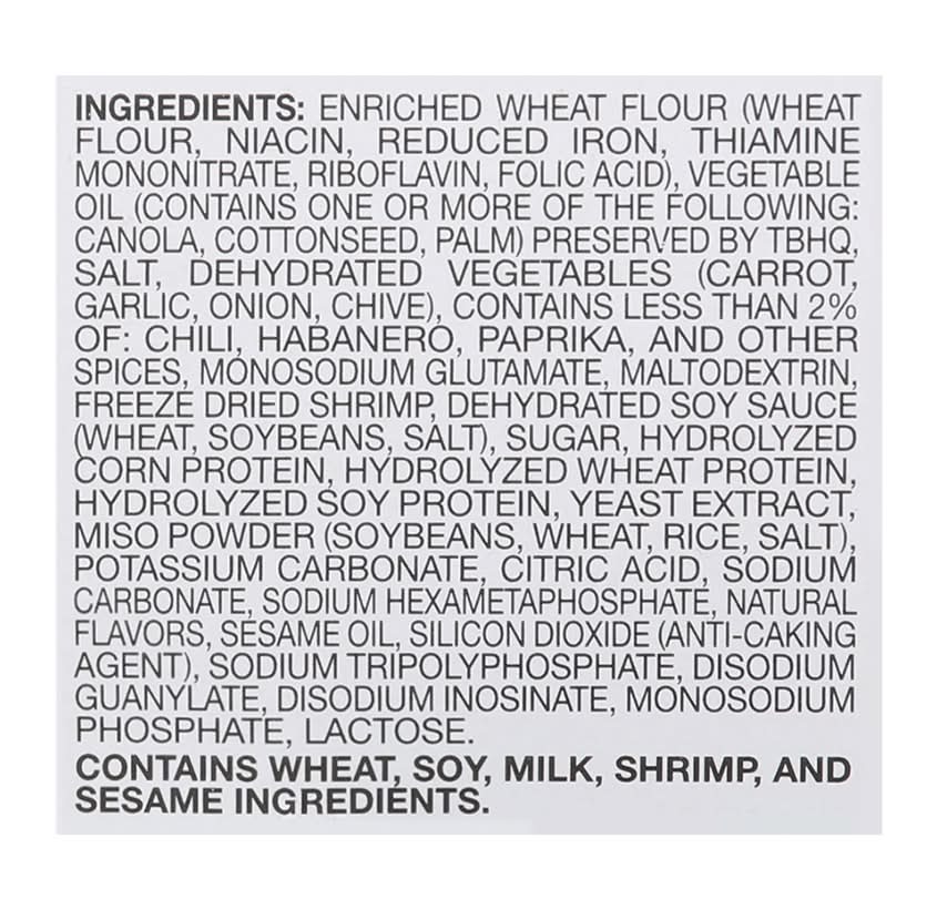Ingredients: Enriched Wheat Flour (Wheat Flour, Niacin, Reduced Iron, Thiamine Mononitrate, Riboflavin, Folic Acid), Vegetable Oil (Contains One or More of the Following: Canola, Cottonseed, Palm) Preserved by TBHQ, Salt, Dehydrated Vegetables (Carrot, Garlic, Onion, Chive), Contains Less than 2% of: Chili, Habanero, Paprika, and Other Spices, Monosodium Glutamate, Maltodextrin, Freeze Dried Shrimp Dehydrated Soy Sauce (Wheat, Soybeans, Salt), Sugar, Hydrolyzed Corn Protein, Hydrolyzed Wheat Protein, Hydrolyzed Soy Protein, Yeast Extract, Miso Powder (Soybeans, Wheat, Rice, Salt), Potassium Carbonate, Citric Acid, Sodium Carbonate, Sodium Hexametaphosphate Natural Flavors, Sesame Oil, Silicon Dioxide (Anti-Caking Agent), Sodium Tripolyphosphate, Disodium Guanylate, Disodium Inosinate, Monosodium Phosphate, Lactose Contains: Wheat, Soybeans, Sesame, Lactose, Corn