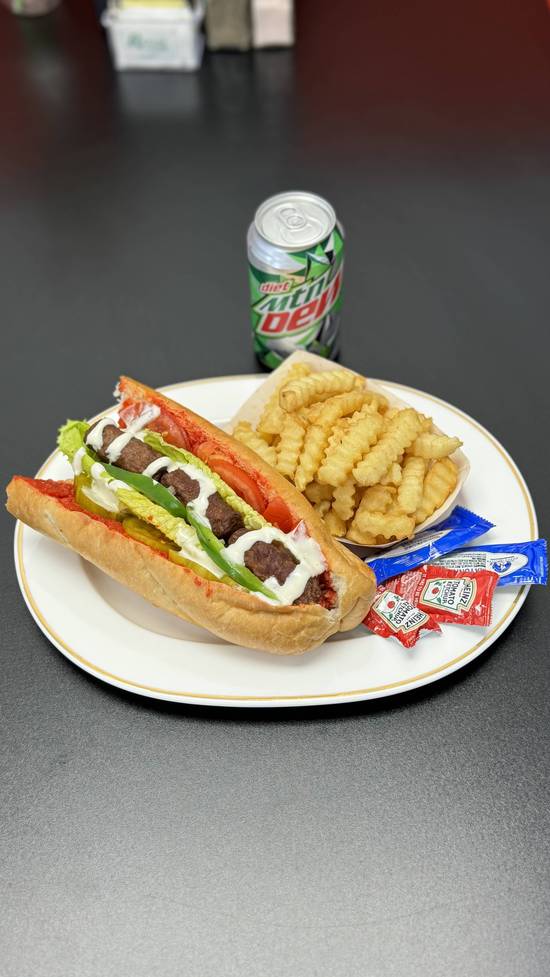 Succulent Turkish meatballs made from a blend of beef and lamb fried to golden perfection and served with in bread paired with red onion, tomatoes, and homemade sauce and French Fries.