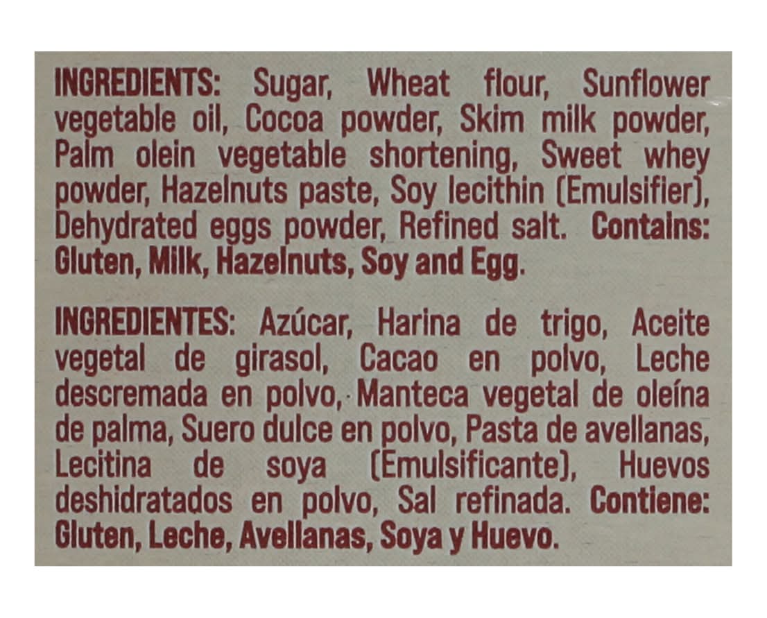 Ingredients: Sugar, Wheat Flour, Sunflower Vegetable Oil, Cocoa Powder, Skim Milk Powder, Palm Olein Vegetable Shortening, Sweet Whey Powder, Hazelnuts Paste, Soy Lecithin [Emulsifier], Dehydrated Eggs Powder, Refined Salt Contains: Gluten, Milk, Tree Nuts, Hazelnuts/Filberts, Soybeans, Eggs, Wheat
