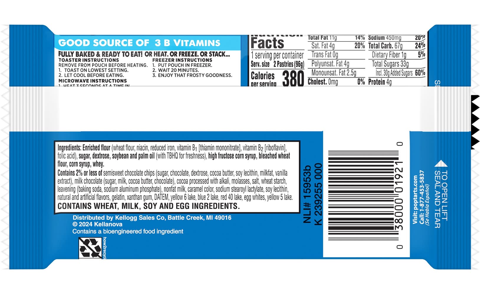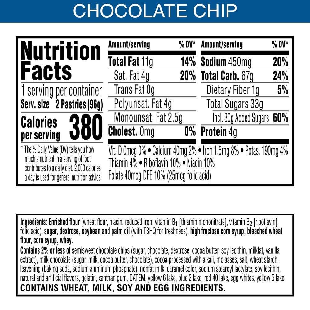Pop-Tarts Frosted Chocolate Chip Drizzle toaster pastries are a delicious treat to look forward to any time of day. Includes one, 3.3-ounce pouch containing two Chocolate Chip Drizzle Pop-Tarts. Jump-start your day with a sweet and decadent blast of gooey, chocolate-flavored filling encased in a chocolate chip pastry crust with chocolate drizzle frosting. It’s a quick and tasty anytime snack for the whole family; Pop-Tarts toaster pastries are an ideal companion for lunchboxes, after-school snacks, and busy, on-the-go moments. Not just for mornings, the versatile deliciousness of Pop-Tarts fits into your lifestyle just about anywhere there's time for a snack. Store them in your desk drawer for a pick-me-up at the office, keep them on hand in your pantry for a sweet after-dinner treat, or bring some in the car for a satisfying snack on the road. These toaster pastries also make welcome additions to care packages, goodie bags, and gift baskets. Just pop them in your toaster for a crisp, warm crust, heat them in the microwave, or enjoy them right out of the foil with a glass of ice-cold milk. Number of servings: 1