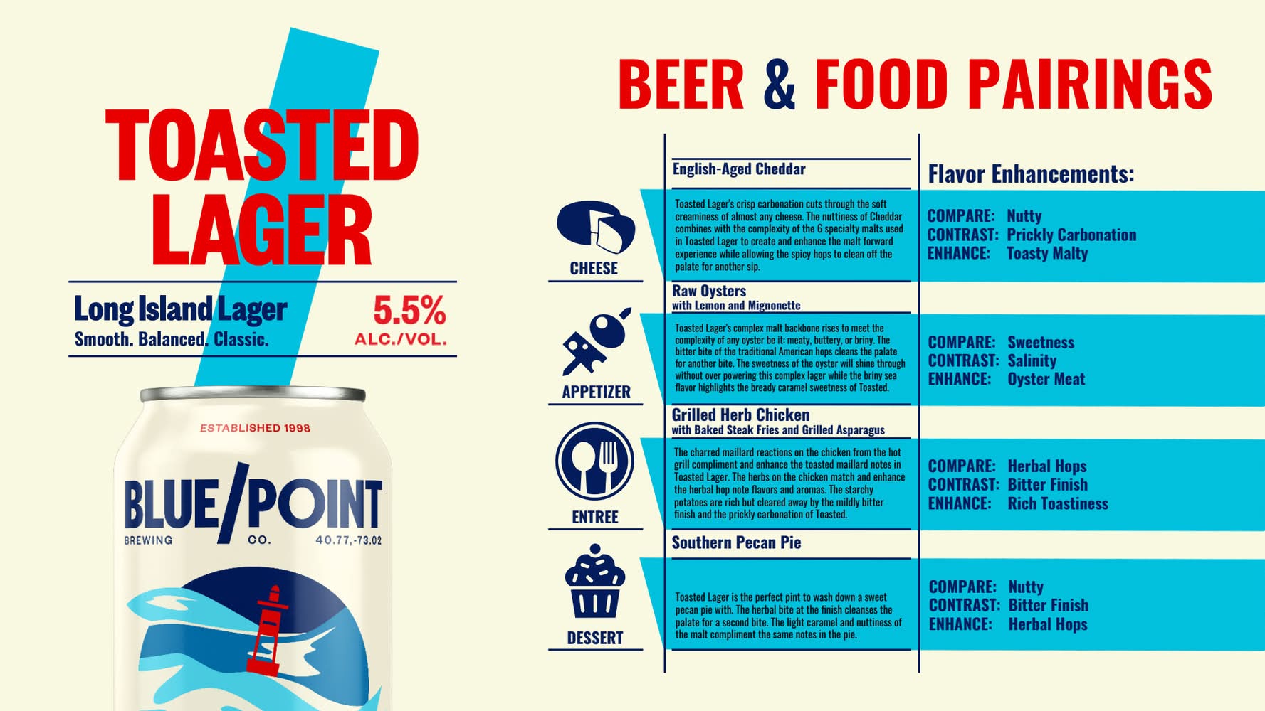 Blue Point Brewing Company Toasted Lager is an American style amber beer with a balanced flavor of malt and hops. Brewed with a blend of six specialty malts, this lager beer has a rich and unique flavor. Not only is this craft beer easy to drink, but it is made with a special proprietary lager yeast that produces an exceptional, long lasting and smooth finish. Blue Point Brewing Company Toasted Lager is a craft alcohol with a 28 IBU rating and a 5.5% ABV per serving. This amber lager pairs perfectly with fresh seafood, and goes well with any food of your choice. Take this four pack of beer cans with you the next time your friends get together. Blue Point Brewing Company has an innovative lineup that showcases their passion for beer in every recipe, barrel and pint. • Pack size: 6 • Alcohol by volume: 5.5% • Blue Point Brewing Company, Patchogue,NY • Packaging: Reusable
