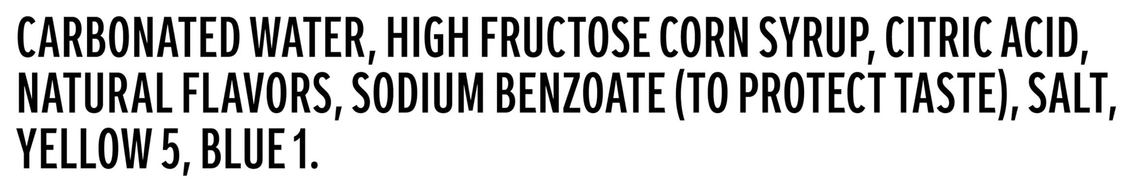 Ingredients: Carbonated Water, High Fructose Corn Syrup, Citric Acid, Natural Flavors, Sodium Benzoate (to Protect Taste), Salt, Yellow 5, Blue 1 Contains: Corn