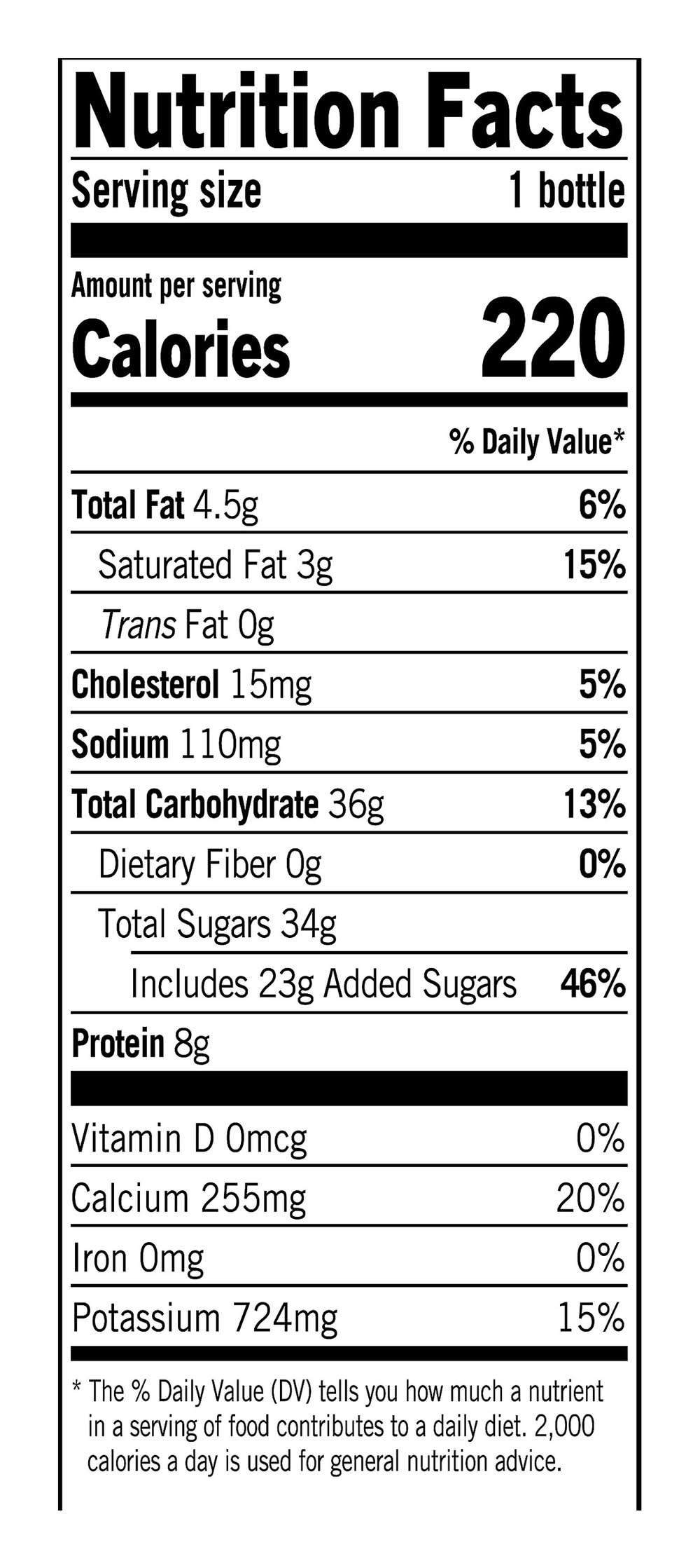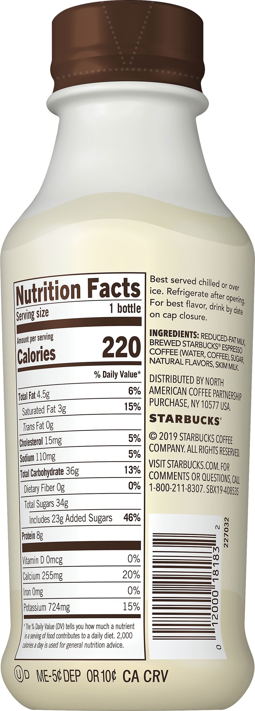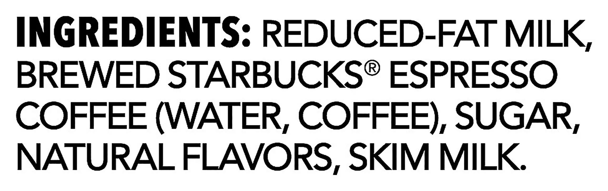Ingredients: Reduced-Fat Milk, Brewed Starbucks Espresso Coffee (Water, Coffee), Sugar, Natural Flavors, Skim Milk Contains: Milk