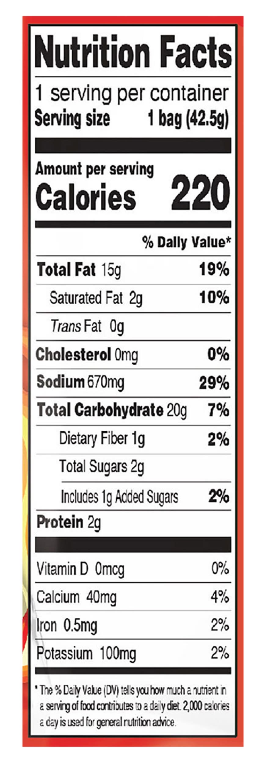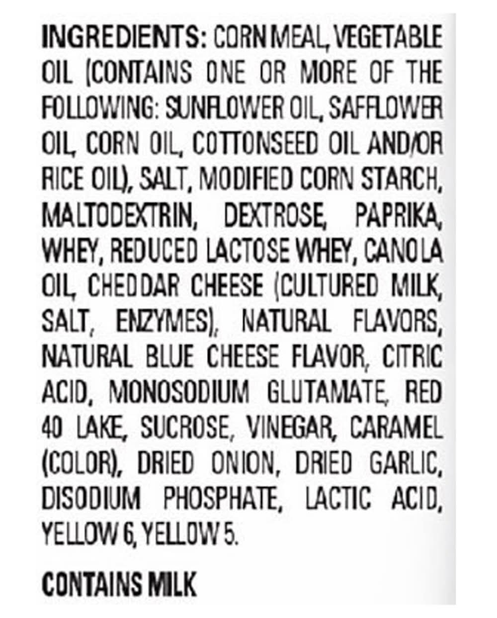Ingredients: Corn Meal, Vegetable Oil (Contains One or More of the Following: Sunflower Oil, Safflower Oil, Corn Oil, Cottonseed Oil and/or Rice Oil), Salt, Modified Corn Starch, Maltodextrin, Dextrose, Paprika, Whey, Reduced Lactose Whey, Canola Oil, Cheddar Cheese (Cultured Milk, Salt, Enzymes), Natural Flavors, Natural Blue Cheese Flavor, Citric Acid, Monosodium Glutamate, Red 40 Lake, Sucrose, Vinegar, Caramel (Color), Dried Onion, Dried Garlic, Disodium Phosphate, Lactic Acid, Yellow 6, Yellow 5 Contains: Milk, Lactose
