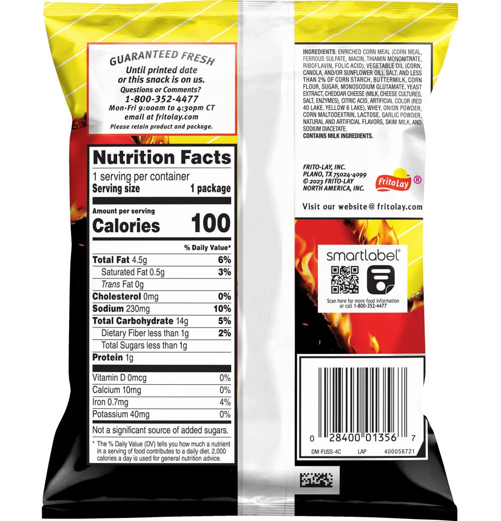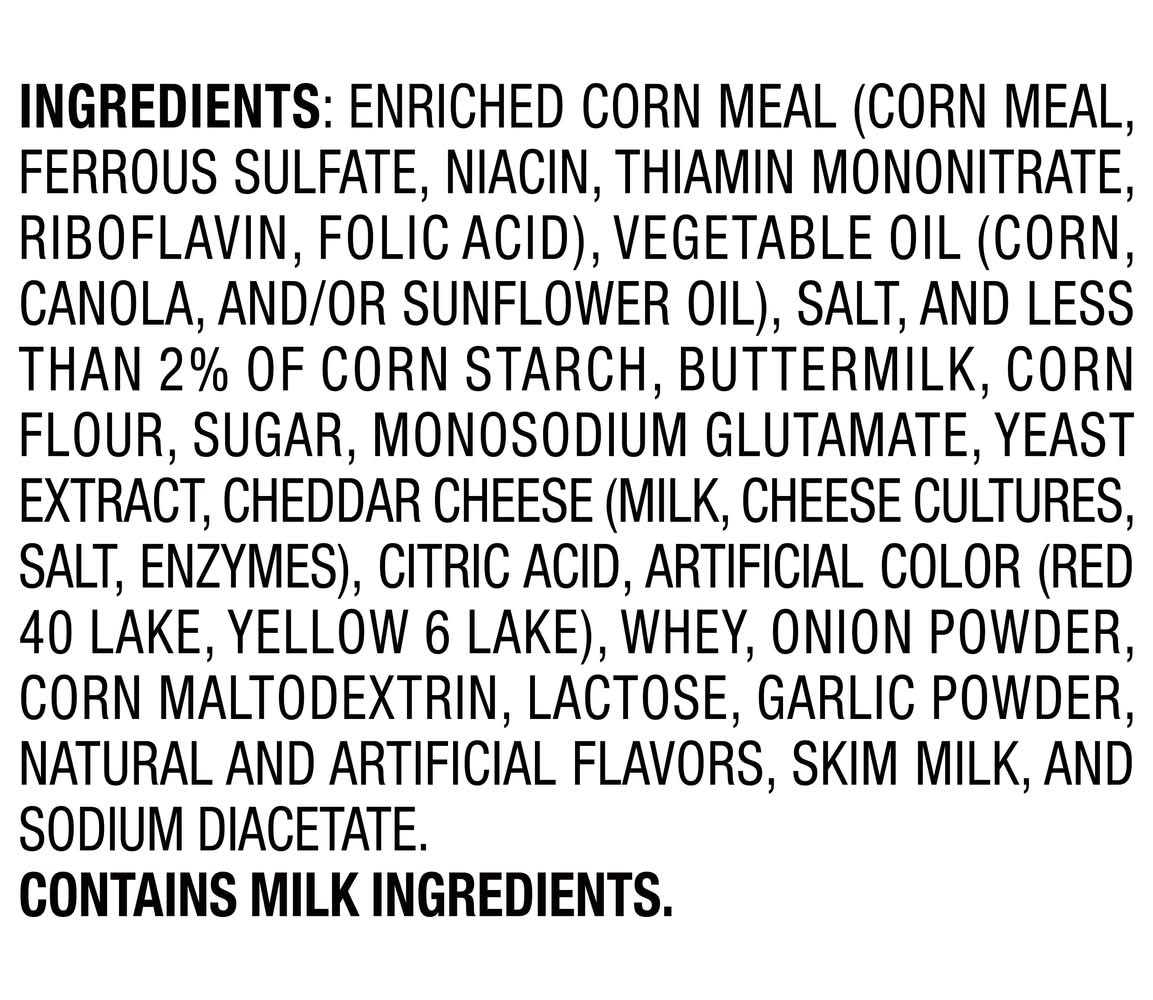 Ingredients: Enriched Corn Meal (Corn Meal, Ferrous Sulfate, Niacin, Thiamin Mononitrate, Riboflavin, Folic Acid), Vegetable Oil (Corn, Canola, And/Or Sunflower Oil), Salt, And Less Than 2% Of Corn Starch, Buttermilk, Corn Flour, Sugar, Monosodium Glutamate, Yeast Extract, Cheddar Cheese (Milk, Cheese Cultures, Salt, Enzymes), Citric Acid, Artificial Color (Red 40 Lake, Yellow 6 Lake), Whey, Onion Powder, Corn Maltodextrin, Lactose, Garlic Powder, Natural And Artificial Flavors, Skim Milk, And Sodium Diacetate. CONTAINS MILK INGREDIENTS. Contains: Milk, Lactose