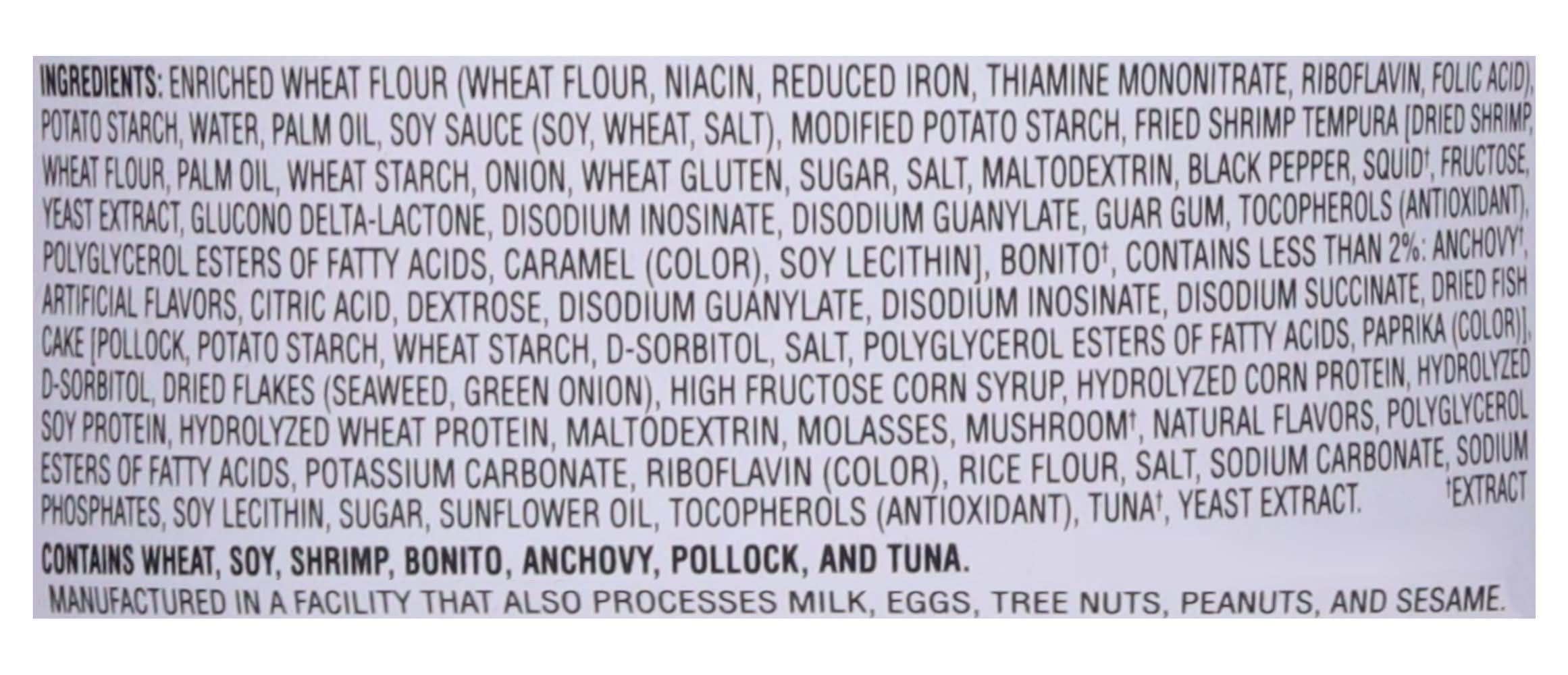Ingredients: Enriched Wheat Flour (Wheat Flour, Niacin, Reduced Iron, Thiamine Mononitrate, Riboflavin, Folic Acid), Potato Starch, Water, Palm Oil, Soy Sauce (Soy, Wheat, Salt), Modified Potato Starch, Fried Shrimp Tempura [Dried Shrimp, Wheat Flour, Palm Oil, Wheat Starch, Onion, Wheat Gluten, Sugar, Salt, Maltodextrin, Black Pepper, Squid (Extract), Fructose Yeast Extract, Glucono Delta-Lactone, Disodium Inosinate, Disodium Guanylate, Guar Gum, Tocopherols (Antioxidant) Polyglycerol Esters of Fatty Acids, Caramel (Color), Soy Lecithin], Bonito (Extract), Contains Less than 2%: Anchovy (Extract) Artificial Flavors, Citric Acid, Dextrose, Disodium Guanylate, Disodium Inosinate, Disodium Succinate, Dried Fish Cake Pollock, Potato Starch, Wheat Starch, D-Sorbitol, Salt, Polyglycerol Esters of Fatty Acids, Paprika (Color)], D-Sorbitol, Dried Flakes (Seaweed, Green Onion), High Fructose Corn Syrup, Hydrolyzed Corn Protein, Hydrolyzed Soy Protein, Hydrolyzed Wheat Protein, Maltodextrin, Molasses, Mushroom (Extract), Natural Flavors, Polyglycerol Esters of Fatty Acids, Potassium Carbonate, Riboflavin (Color), Rice Flour, Salt, Sodium Carbonate, Sodium Phosphates, Soy Lecithin, Sugar, Sunflower Oil, Tocopherols (Antioxidant), Tuna (Extract), Yeast Extract Contains: Wheat, Crustacean Shellfish, Shrimp, Fish, Bonito, Fish, Anchovy, Fish, Pollock, Fish, Tuna, Soybeans, Gluten, Corn, Milk, Eggs, Tree Nuts, Peanuts, Sesame