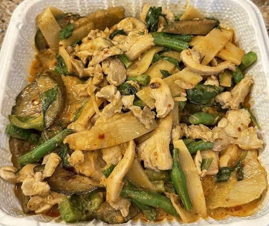 Stir-fried red curry paste with egg plant, green beans, bamboo, bell peppers, basil, and light coconut milk.