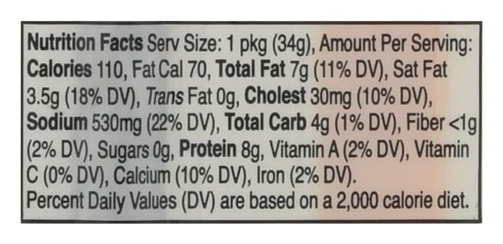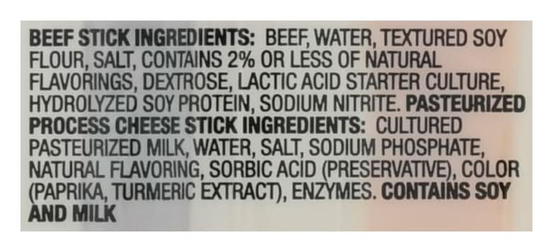 Ingredients: Beef Stick Ingredients: Beef, Water, Textured Soy Flour, Salt, Contains 2% or Less of Natural Flavorings, Dextrose, Lactic Acid Starter Culture, Hydrolyzed Soy Protein, Sodium Nitrite. Pasteurized Process Cheese Stick Ingredients: Cultured Pasteurized Milk, Water, Salt, Sodium Phosphate, Natural Flavoring, Sorbic Acid (Preservative), Color (Paprika, Turmeric Extract), Enzymes Contains: Soybeans, Milk