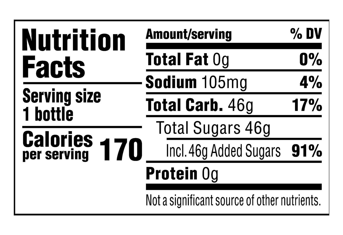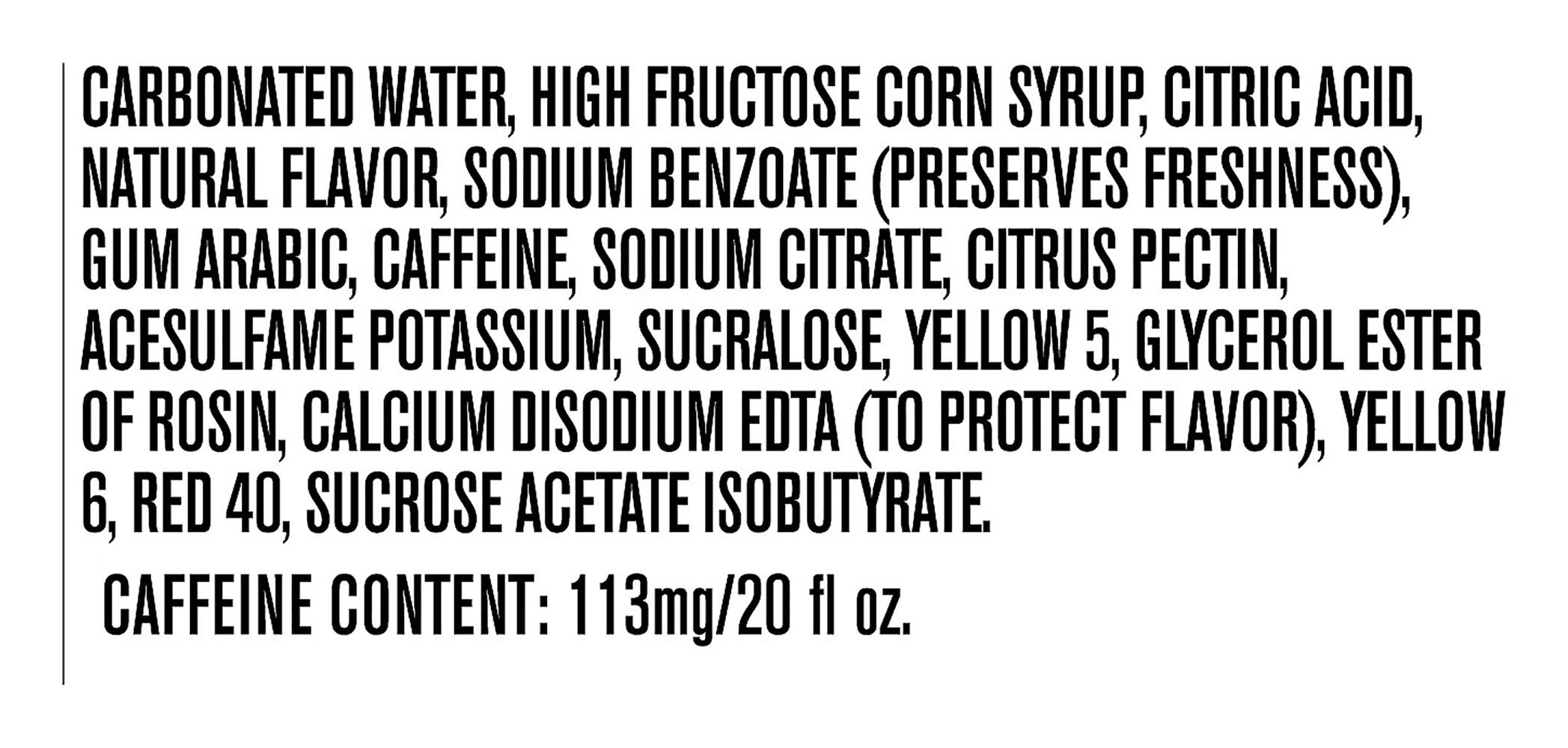 Ingredients: Carbonated Water, High Fructose Corn Syrup, Citric Acid, Natural Flavor, Sodium Benzoate (Preserves Freshness), Gum Arabic, Caffeine, Sodium Citrate, Citrus Pectin, Acesulfame Potassium, Sucralose, Yellow 5, Glycerol Ester of Rosin, Calcium Disodium EDTA (to Protect Flavor), Yellow 6, Red 40, Sucrose Acetate Isobutyrate.