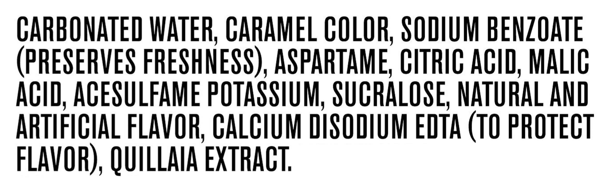 Ingredients: Carbonated Water, Caramel Color, Sodium Benzoate (Preserves Freshness), Aspartame, Citric Acid, Malic Acid, Acesulfame Potassium, Sucralose, Natural and Artificial Flavor, Calcium Disodium EDTA (to Protect Flavor), Quillaia Extract