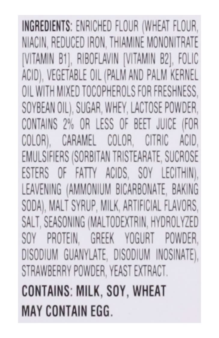 Ingredients: Enriched Flour (Wheat Flour, Niacin, Reduced Iron, Thiamine Mononitrate [Vitamin B1], Riboflavin [Vitamin B2], Folic Acid), Vegetable Oil (Palm and Palm Kernel Oil with Mixed Tocopherols for Freshness, Soybean Oil), Sugar, Whey, Lactose Powder, Contains 2% or Less of Beet Juice (for Color), Caramel Color, Citric Acid, Emulsifiers (Sorbitan Tristearate, Sucrose Esters of Fatty Acids, Soy Lecithin), Leavening (Ammonium Bicarbonate, Baking Soda), Malt Syrup, Milk, Artificial Flavors, Salt, Seasoning (Maltodextrin, Hydrolyzed Soy Protein, Greek Yogurt Powder, Disodium Guanylate, Disodium Inosinate), Strawberry Powder, Yeast Extract Contains: Milk, Soybeans, Wheat, Lactose, Eggs