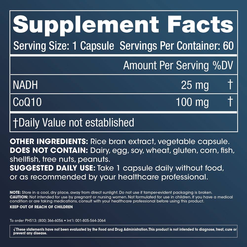 Every cell in the body requires ATP (energy) to function properly and a continual supply of this crucial element is essential to the proper function of the heart, brain, nerves and muscles. NADH and CoQ10 are crucial coenzymes for producing cellular energy. Adding daily supplementation of NADH and CoQ10 can help to support ATP production, providing increased energy levels, improved mood and greater mental focus. NADH helps with energy levels because each molecule of NADH produces three molecules of energy in the form of ATP. CoQ10 also helps with energy levels because it is an essential coenzyme needed to make energy from food. The form of CoQ10 in this formula is Ubiquinone.