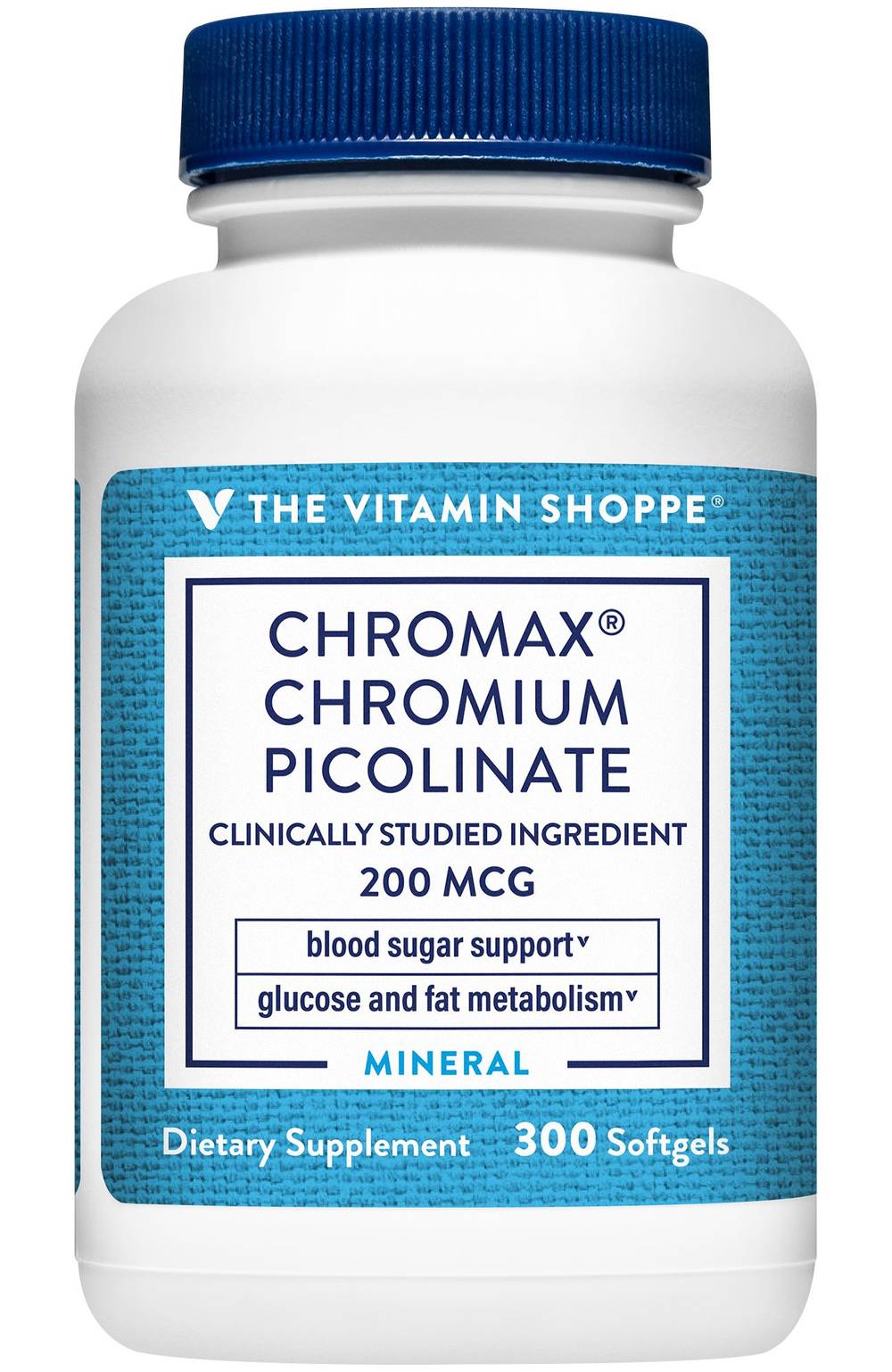 Supports healthy blood sugar levels Promotes glucose and fat metabolism Free of gluten, dairy, nuts, sugar, salt, and artificial flavors Everyone loves a good dream team, and you'll love The Vitamin Shoppe� brand Chromax� Chromium Picolinate. Chromax combines the essential trace mineral chromium and picolinic acida chelator that promotes increased absorption of chromium in the body. Together, these elements work to support healthy blood sugar levels while promoting glucose and fat metabolism. Each softgel contains 200mcg of clinically studied Chromax to support your health and wellness goals.