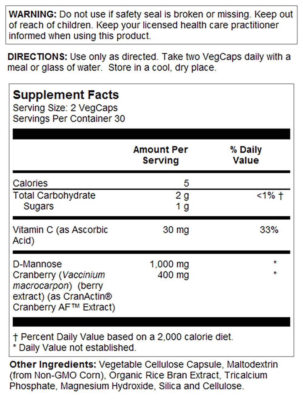 D-Mannose With Cranactin - Urinary Tract Health - 1,000 Mg (60 Vegetarian Capsules)