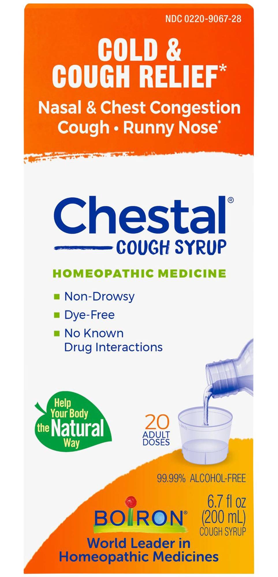 Boiron Chestal Cold & Cough 6.7 fl oz temporarily relieves symptoms of the common cold such as: nasal and chest congestion, fitful cough, sneezing, minor sore throat, runny or stuffy nose.