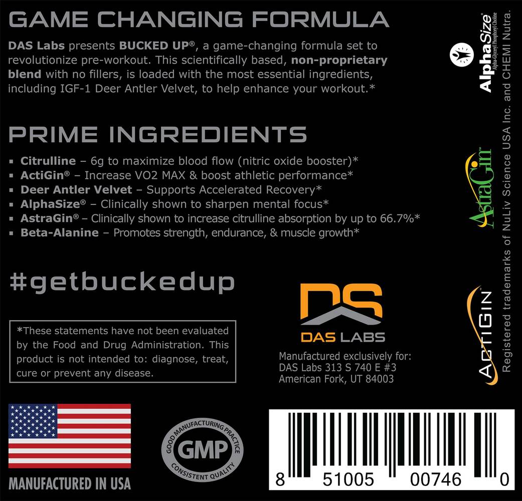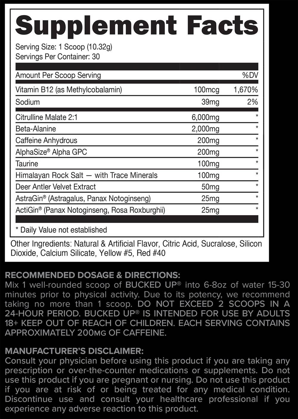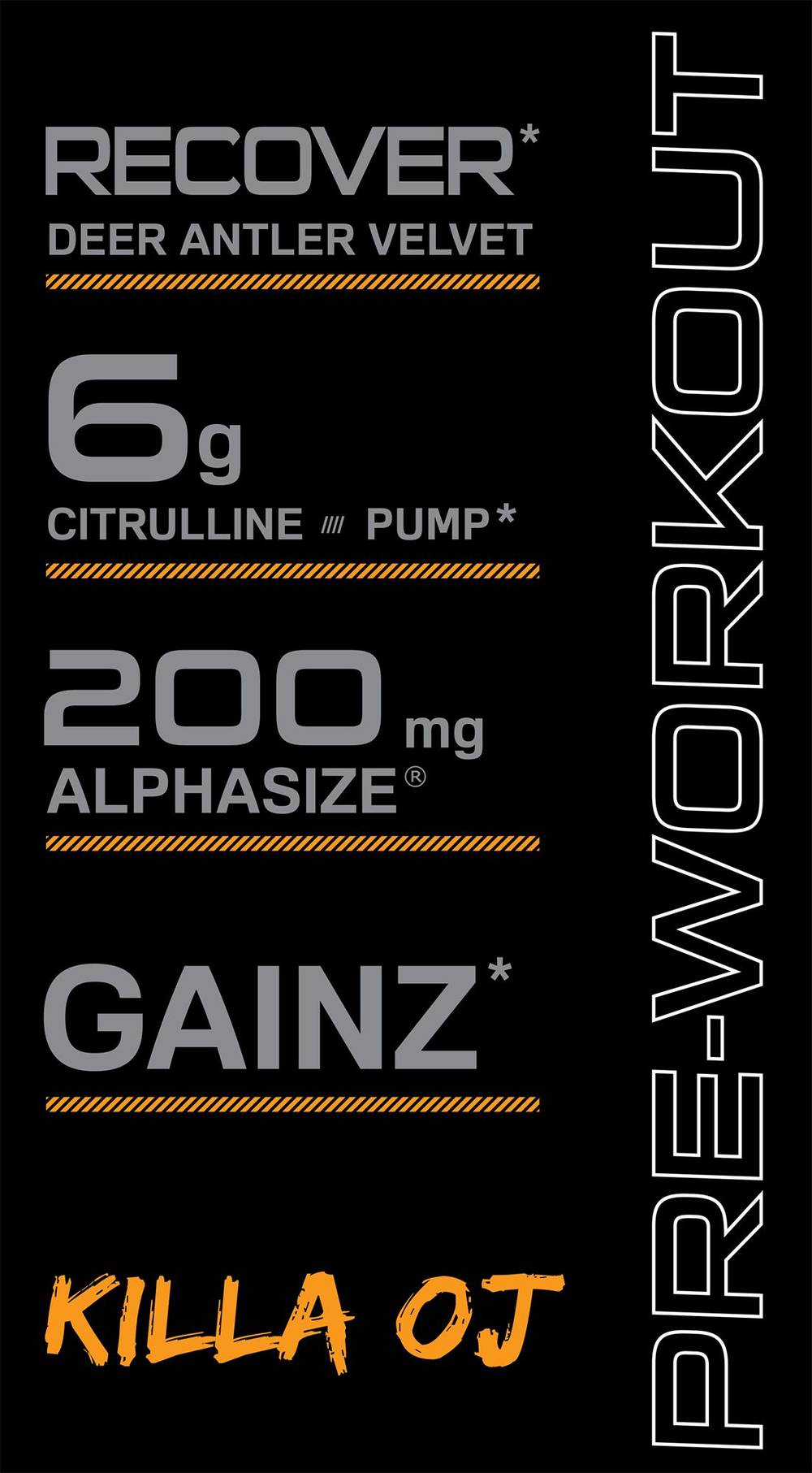 Bring your A game to the field or gym with support from the Bucked Up pre-workout supplement. With scientifically-backed ingredients and vital nutrients, the advanced mix boosts muscles, aids focus, and powers pumps and performance. Transparency is a core principal for Bucked Up's offerings, so you can rest assured this elite formula is serving up the best. The Killa OJ-flavored powder features: Citrulline to support healthy blood flow and boost nitric oxideHimalayan Sea Salt to provide 80+ trace minerals and support electrolyte balanceActiGin® to increase VO2 MAX and enhance performanceDeer Antler Velvet for recoveryAlphaSize® to sharpen mental focusAstraGin® to elevate citrulline absorptionBeta-Alanine to pr