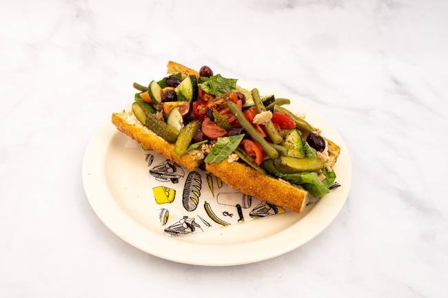 superba baguette/ tuna conserva/ anchovy/ olives/ harissa potato/ pickled green beans.