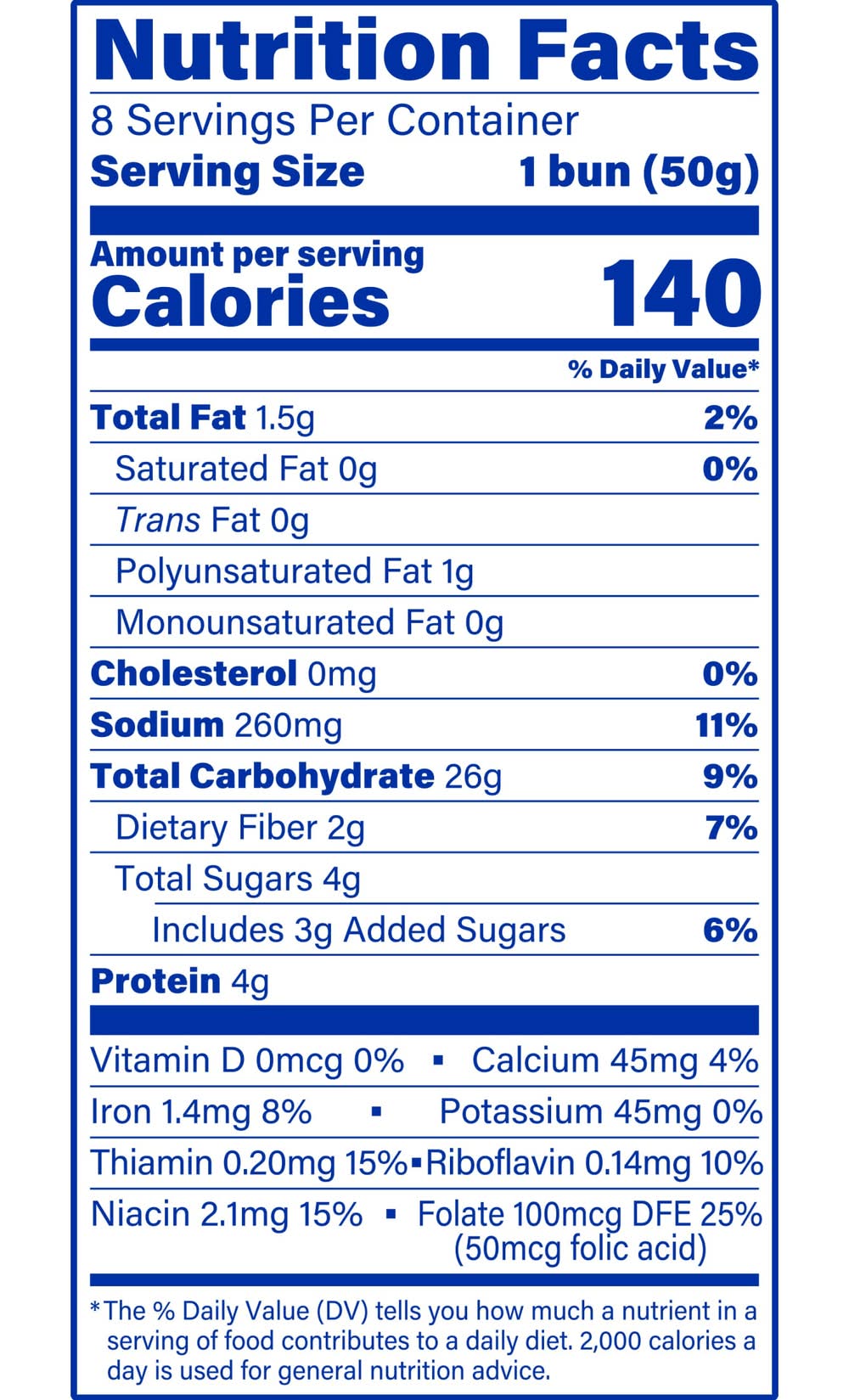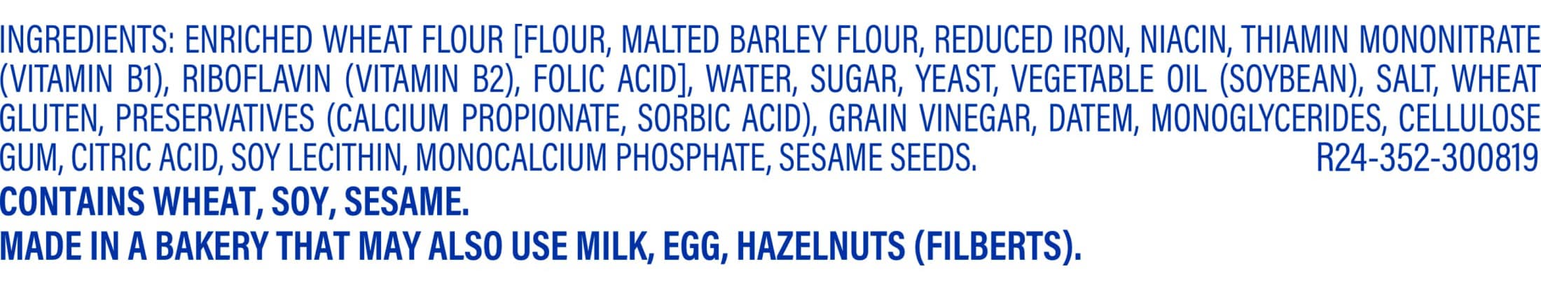 Ingredients: ENRICHED WHEAT FLOUR [FLOUR, MALTED BARLEY FLOUR, REDUCED IRON, NIACIN, THIAMIN MONONITRATE (VITAMIN B1), RIBOFLAVIN (VITAMIN B2), FOLIC ACID], WATER, SUGAR, YEAST, VEGETABLE OIL (SOYBEAN), SALT, WHEAT GLUTEN, PRESERVATIVES [CALCIUM PROPIONATE, SORBIC ACID], GRAIN VINEGAR, DATEM, MONOGLYCERIDES, CELLULOSE GUM, CITRIC ACID, SOY LECITHIN, MONOCALCIUM PHOSPHATE, SESAME SEEDS. Contains: CONTAINS SESAME, SOY, WHEAT.