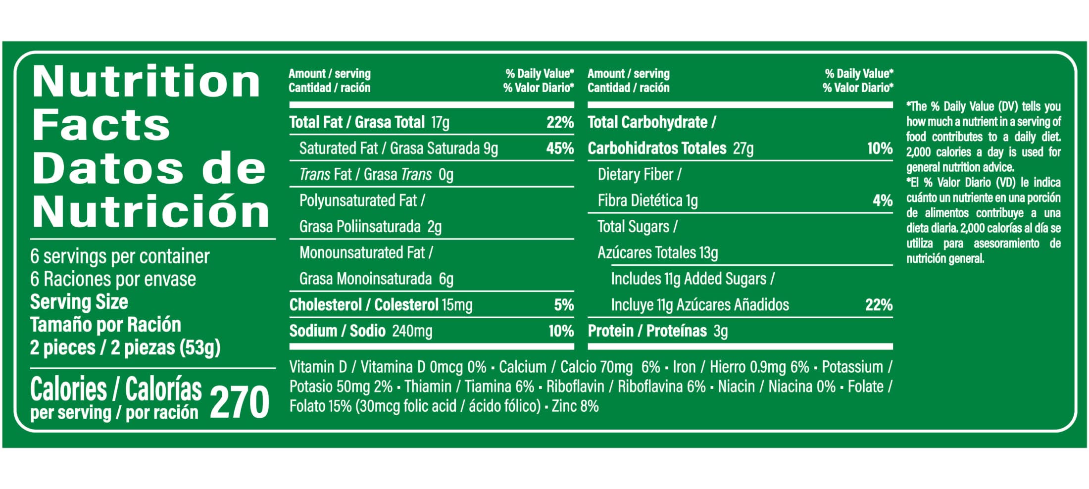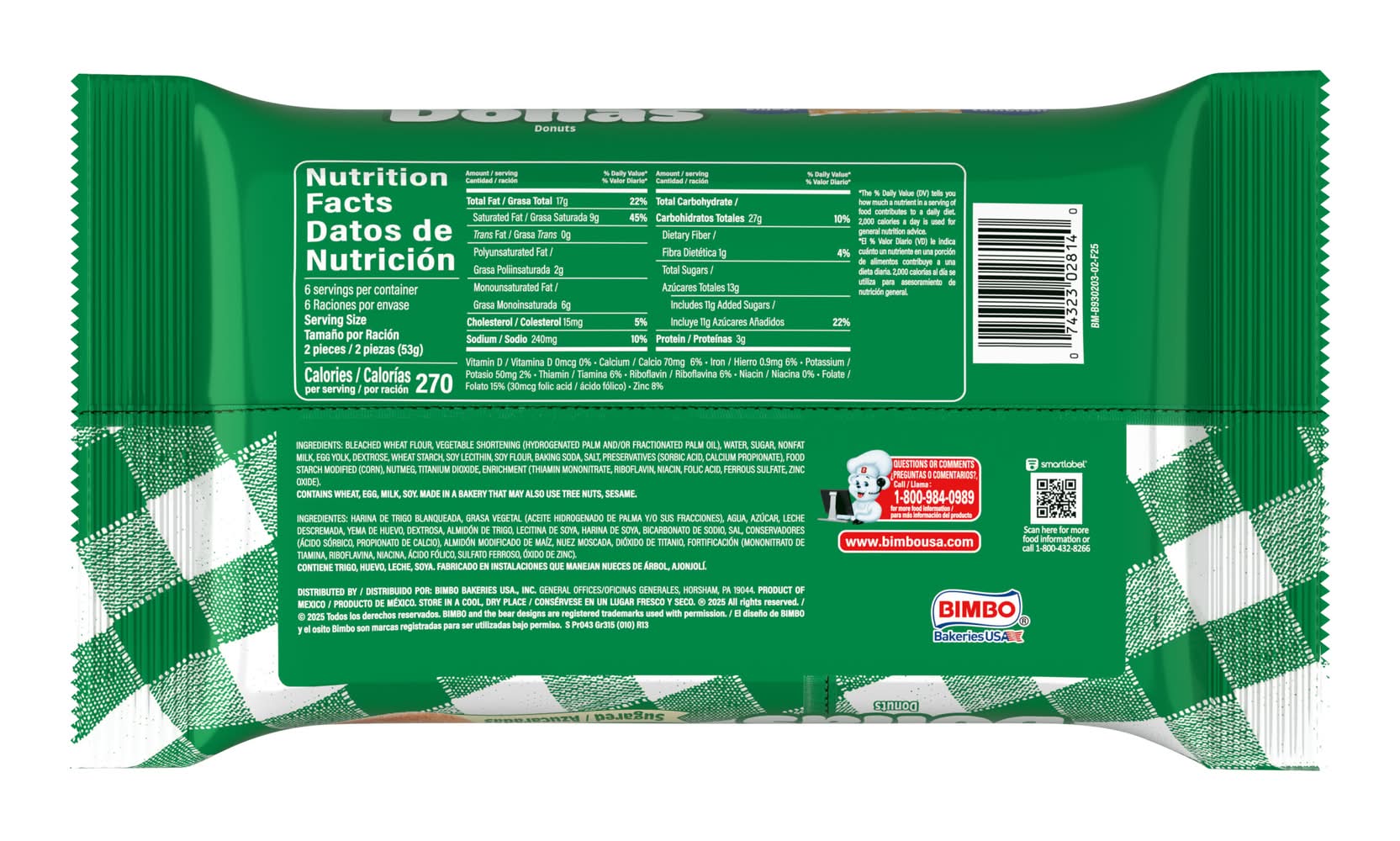 Per 2 Piece Serving: 230 calories, 6 g sat fat (30% DV), 160 mg sodium (7% DV), 13 g total sugars. www.bimbousa.com. SmartLabel: Scan for more food information. : Rebanadas. Keep your city clean. Product of Mexico. Bimbo bakeries usa nc., Horsham,PA,19044