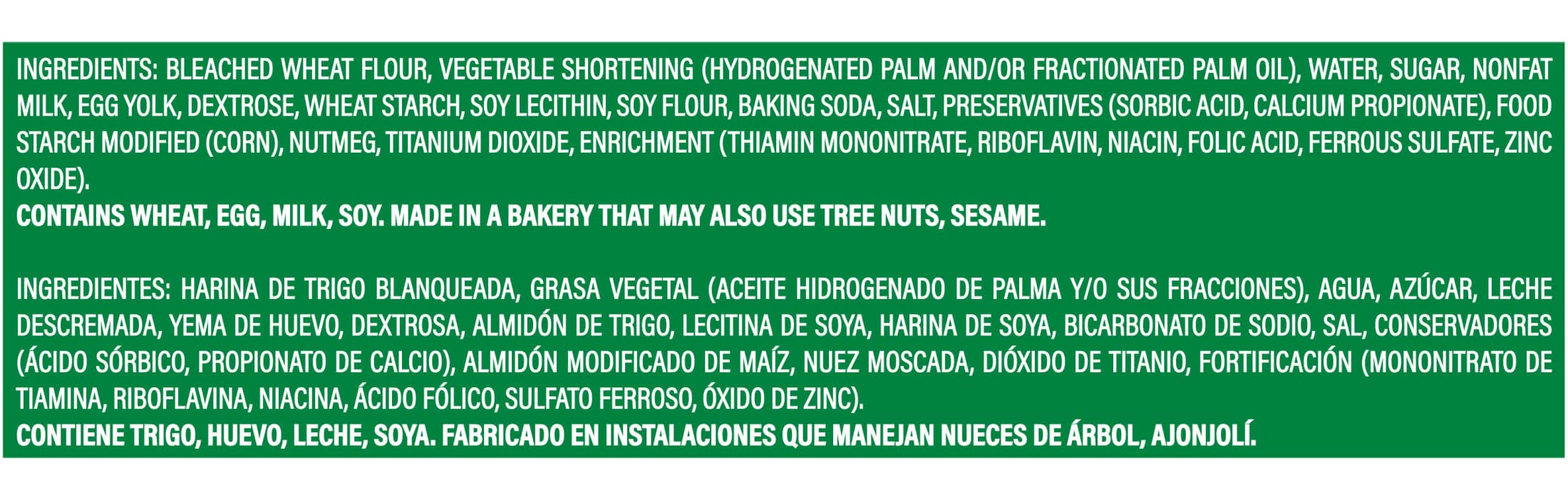 Ingredients: Wheat Flour, Water, Vegetable Shortening Palm and/or Fractionated Palm Oil, Sugar, Nonfat Milk, Tub Rum, Soda, Aluminum Sodium Sulfate, Monocalcium Phosphate, Sodium Acid Pyrophosphate, Wheat Starch, Mono & Diglycerides, Soy Lecithin, Soy Flour, Enzymes, Xanthan Gum, Donut Covering [Dextrose Food Starch-Modified Potato, Corn, Vegetable Shortening Palm, Titanium Dioxide, Calcium Propionate Preservative], Potassium Chloride Salt, Cellulose Gum, Guar Gum, Carrageenan, Preservatives Sorbic Acid, Sodium Propionate, Whole Milk, Natural and Artificial Flavor, Nutmeg Powder, Enrichment Thiamin Mononitrate, Riboflavin, Niacin, Folic Acid, Reduced Iron, Zinc Oxide Contains: CONTAINS EGG, MILK, SOY, WHEAT.
