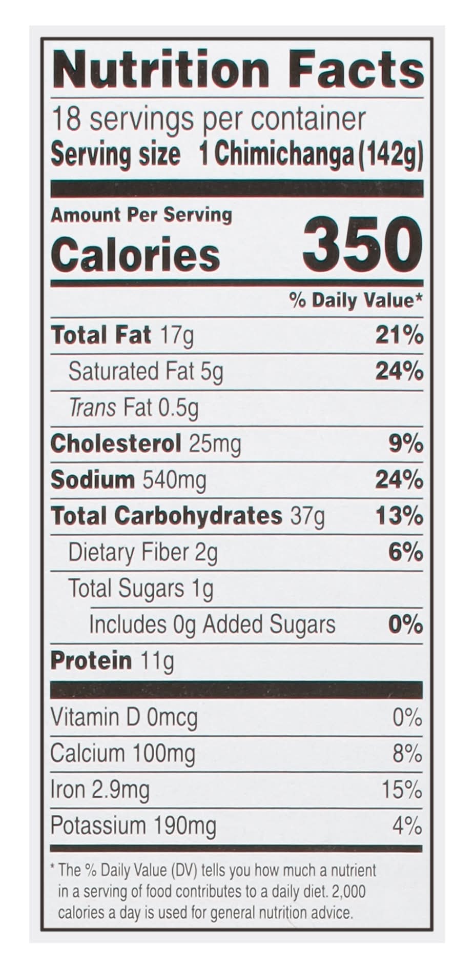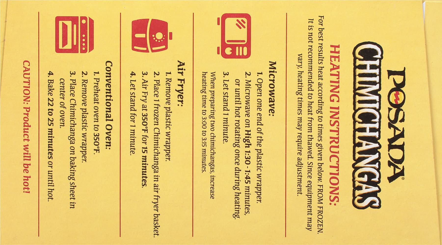 Directions for use: Directions: Heating Instructions: For best results heat according to times given below. From frozen. It is not recommended to heat from thawed. Since equipment may vary, heating times may require adjustment. Microwave: 1. Open one end of the plastic wrapper. 2. Microwave on high 1:30 - 1:45 minutes, or until hot rotating once during heating. 3. Let stand 1 minute. When preparing two chimichangas, increase heating time to 3:00 to 3:15 minutes. Air Fryer: 1. Remove plastic wrapper. 2. Place 1 frozen Chimichanga in air fryer basket. 3. Air fry at 350 degrees F for 15 minutes. 4. Let stand for 1 minute. Conventional Oven: 1. Preheat oven to 350 degrees F. 2. Remove plastic wrapper. 3. Place Chimichanga on baking sheet in center of oven. 4. Bake 22 to 25 minutes or until hot. Caution: Product will be hot! Previously handled frozen for your protection, refreeze or keep refrigerated. Storage recommendation: Previously handled frozen for your protection, refreeze or keep refrigerated.