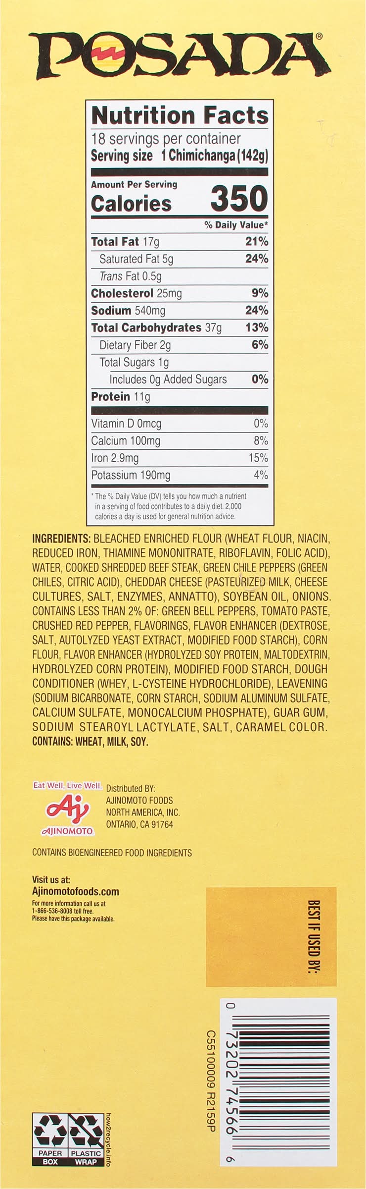 Ingredients: Bleached Enriched Flour (Wheat Flour, Niacin, Reduced Iron, Thiamine Mononitrate, Riboflavin, Folic Acid), Water, Cooked Shredded Beef Steak, Green Chile Peppers (Green Chiles, Citric Acid), Cheddar Cheese (Pasteurized Milk, Cheese Cultures, Salt, Enzymes, Annatto), Soybean Oil, Onions, Contains Less than 2% of: Green Bell Peppers, Tomato Paste, Crushed Red Pepper, Flavorings, Flavor Enhancer (Dextrose, Salt, Autolyzed Yeast Extract, Modified Food Starch), Corn Flour, Flavor Enhancer (Hydrolyzed Soy Protein, Maltodextrin, Hydrolyzed Corn Protein), Modified Food Starch, Dough Conditioner (Whey, L-Cysteine Hydrochloride), Leavening (Sodium Bicarbonate, Corn Starch, Sodium Aluminum Sulfate, Calcium Sulfate, Monocalcium Phosphate), Guar Gum, Sodium Stearoyl Lactylate, Salt, Caramel Color Contains: Wheat, Milk, Soybeans, Corn