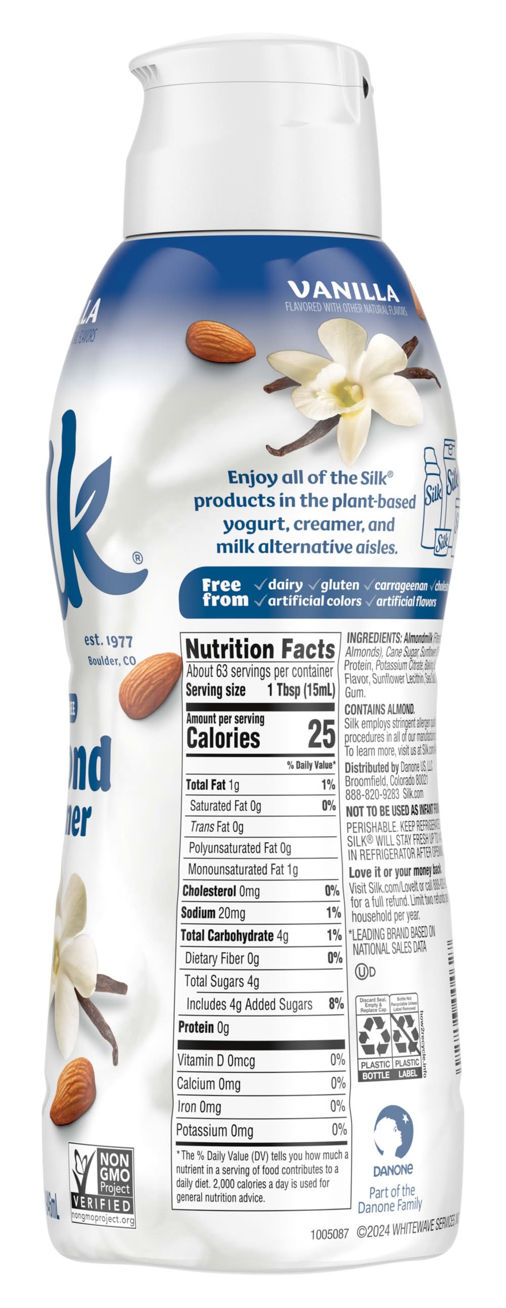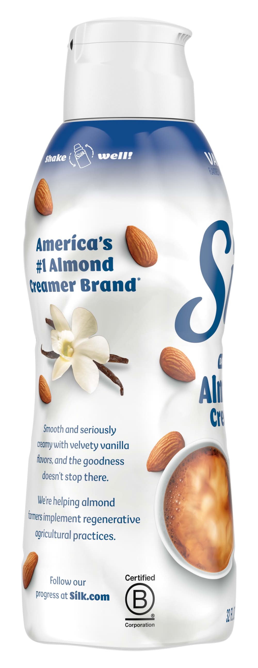 Make your days more flavorful with Silk Vanilla Almond Creamer. Not your average vanilla coffee creamer, this smooth and lusciously creamy dairy free almond vanilla creamer is a great way to start your day. Silk creamer is free from dairy, lactose, carrageenan and gluten, making it a great choice for any lifestyle. Plus, there are no artificial colors or flavors in this vanilla flavored creamer. Make a “me” moment by adding a splash of this vanilla flavored vegan creamer to smoothies, shakes, your morning coffee or anything that could use a smooth and creamy almond boost. At Silk, we believe in the power of plants to do a world of good, so people can enjoy good, feel good and do good. Silk gluten free, non dairy creamer is the 1 brand of plant based creamers.* It’s also Non-GMO Project Verified. Silk is passionate about doing right by the planet, which is why we're helping almond farmers implement regenerative agriculture practices. Level up your coffee experience with Silk Almond Creamer. *Leading brand based on national sales data. • Flavor: Vanilla • Whitewave Foods, Broomfield, CO, 80021 • Packaging: Reusable