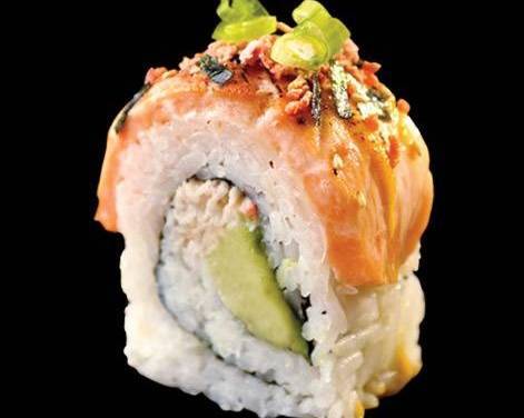 Imitation crab meat, avocado, topped baked salmon furikake & scallion.(Eel sauce and spicy mayo on top.)